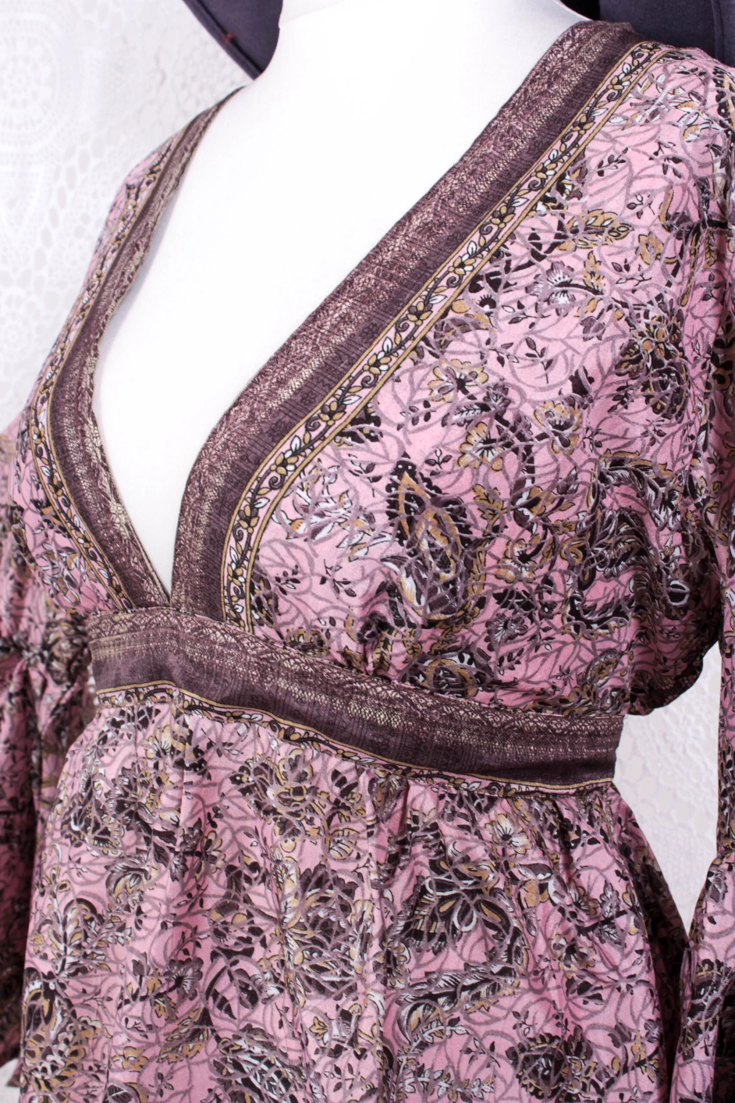 Fabric: Vintage Indian silk mix –Â The Fabric is Vintage Indian Sari and of Unknown Exact Content Blend, feels like a silky poly mix blend. There can be very minor flaws, such as pulled threads or tiny marks, but any large faults or stains will always be mentioned.