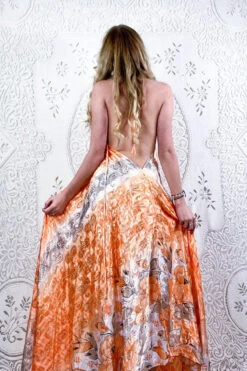 Eden Halter Maxi Dress – Vintage Sari – Peach Beach Botanical Jacquard – Free Size M/L