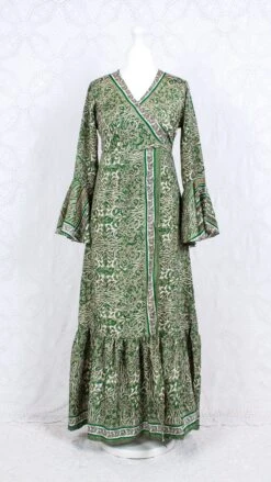 Sylvia Wrap Dress – Vintage Indian Sari – Champagne, Garnet & Raven Bold Paisley Shimmer (S/M)