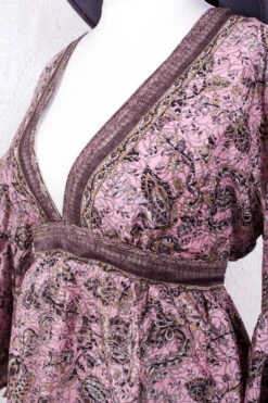 Cherry Midi Dress – Vintage Indian Sari – Seafoam, Sienna & Violet Tile Print – Free Size