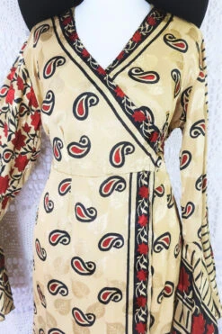 Sylvia Wrap Dress – Vintage Indian Sari – Champagne, Garnet & Raven Bold Paisley Shimmer (S/M)