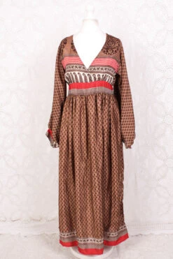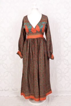 Rosemary Maxi Dress – Vintage Indian Sari – Steely Blue & Electric Coral Floral Paisley – XS/S