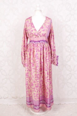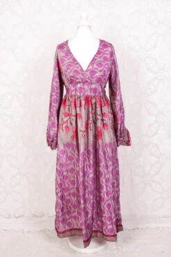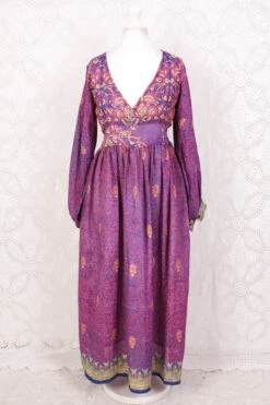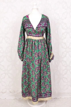 Rosemary Maxi Dress – Vintage Indian Sari – Emerald & Magenta Peacock Illustrations – XS/S