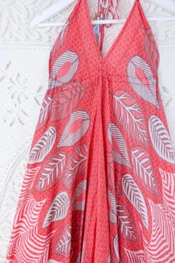SALE – Blossom Halter Maxi Dress – Vintage Sari – Coral Pink & Taupe Leaf Print – Free Size S/M