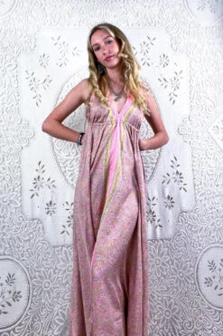 Eden Halter Maxi Dress – Vintage Sari – Pastel Pink & Chartreuse Paisley – Free Size S/M