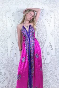 Eden Halter Maxi Dress – Vintage Sari – Fuchsia Pink & Purple Wildflower – Free Size M/L