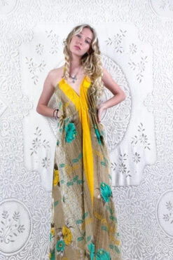 Eden Halter Maxi Dress – Vintage Sari – Lemon Yellow & Turquoise Tropical Floral – Free Size S/M