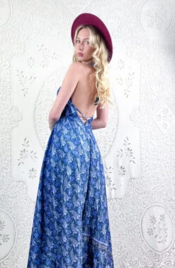 Eden Halter Maxi Dress – Vintage Sari – Majorelle Blue & Beige Leaf Print – Free Size S/M