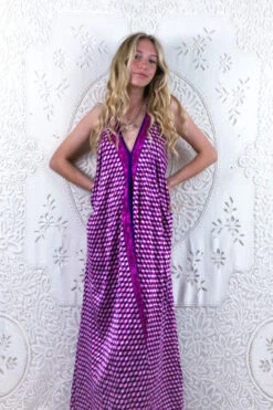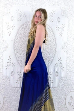 Athena Maxi Dress – Vintage Sari – Midnight Blue & Champagne Peacock Print – XS – S/M