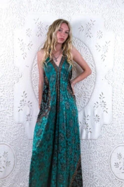 Athena Maxi Dress – Vintage Sari – Ocean Teal, Brown & Gold Block Print Floral – XS – S/M