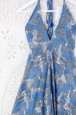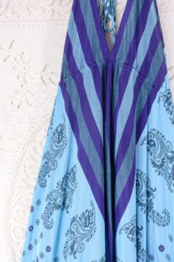 Blossom Halter Maxi Dress – Vintage Sari – Azure Blue & Grey Jacquard – Free Size M/L