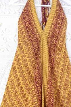 Blossom Halter Maxi Dress – Vintage Sari – Mustard Yellow & Burgundy Paisley – Free Size L/XL