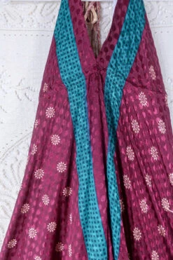 Blossom Halter Maxi Dress – Vintage Sari – Mulberry & Teal Floral Motif – Free Size M/L