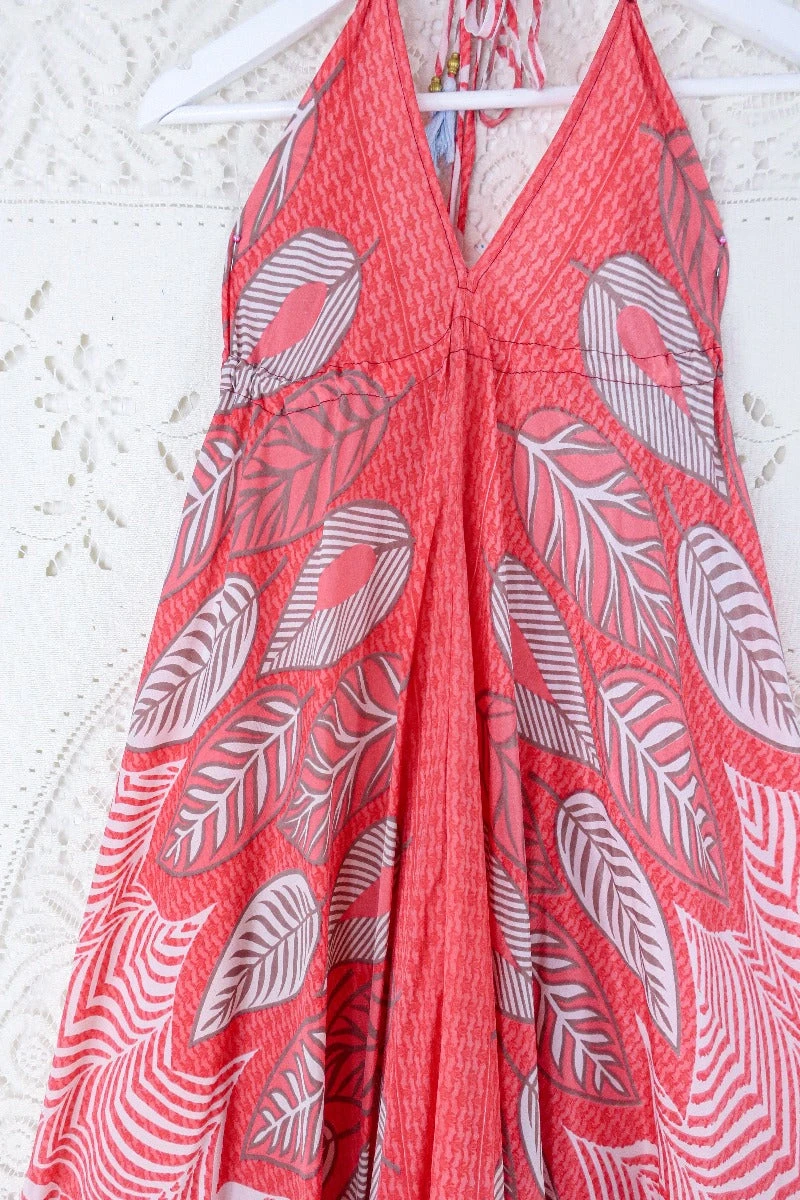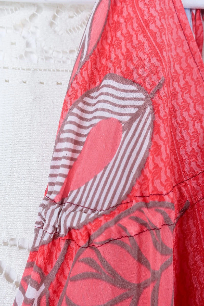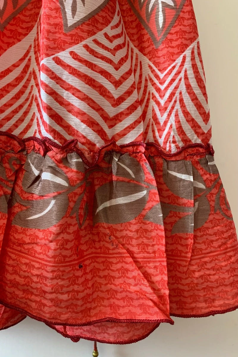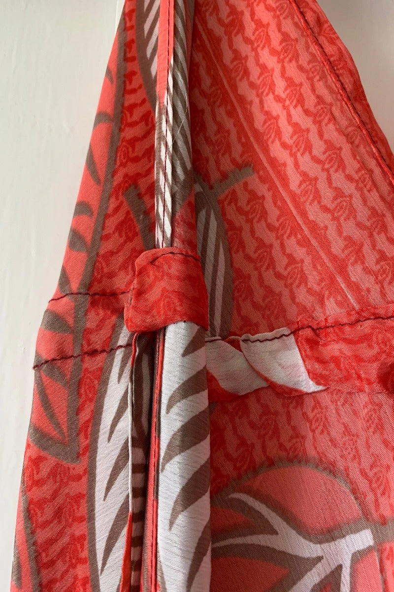 Made from vintage recycled Indian fabrics. Super soft silky material with a gorgeous colour and print. It has adjustable ribbon ties at the neck and waist to fit you perfectly.
