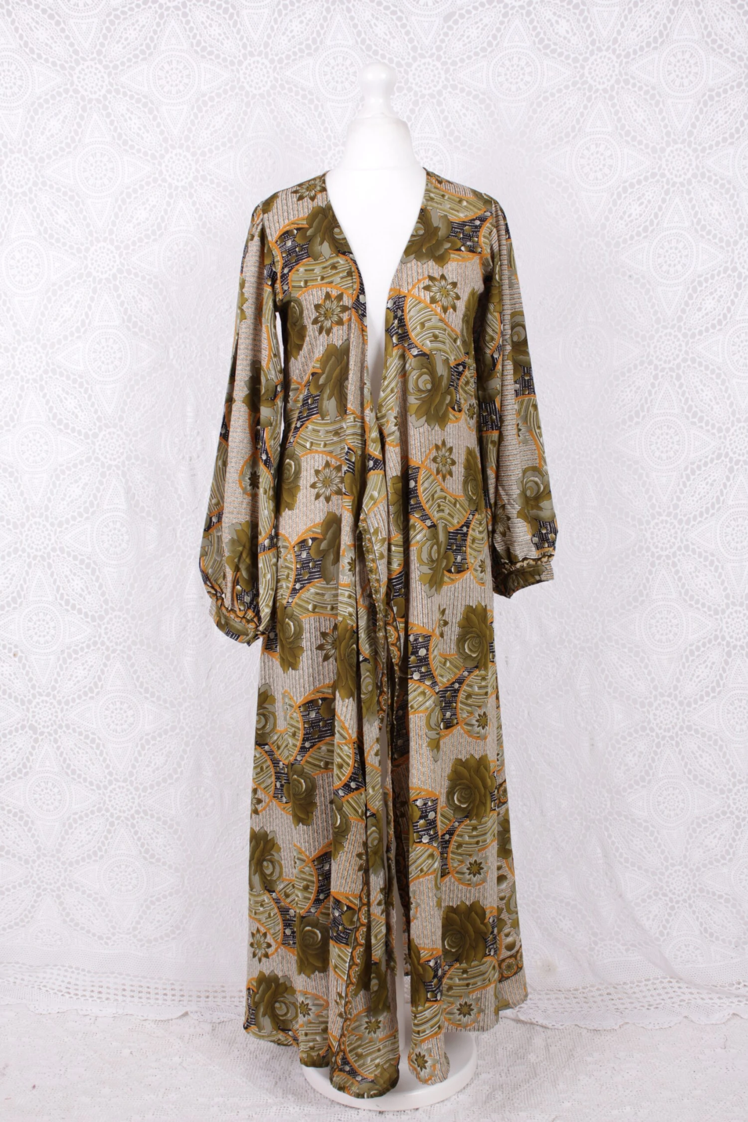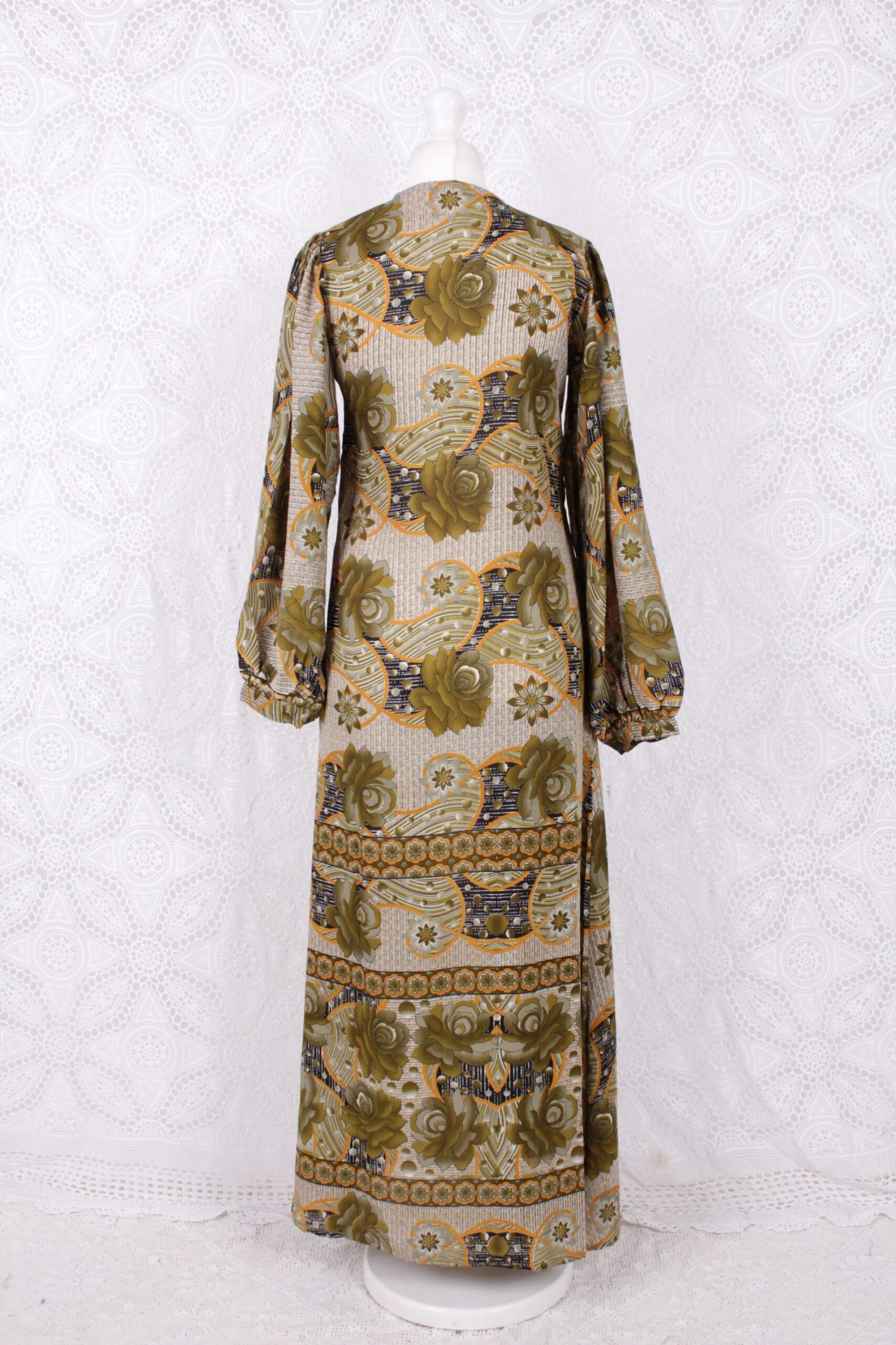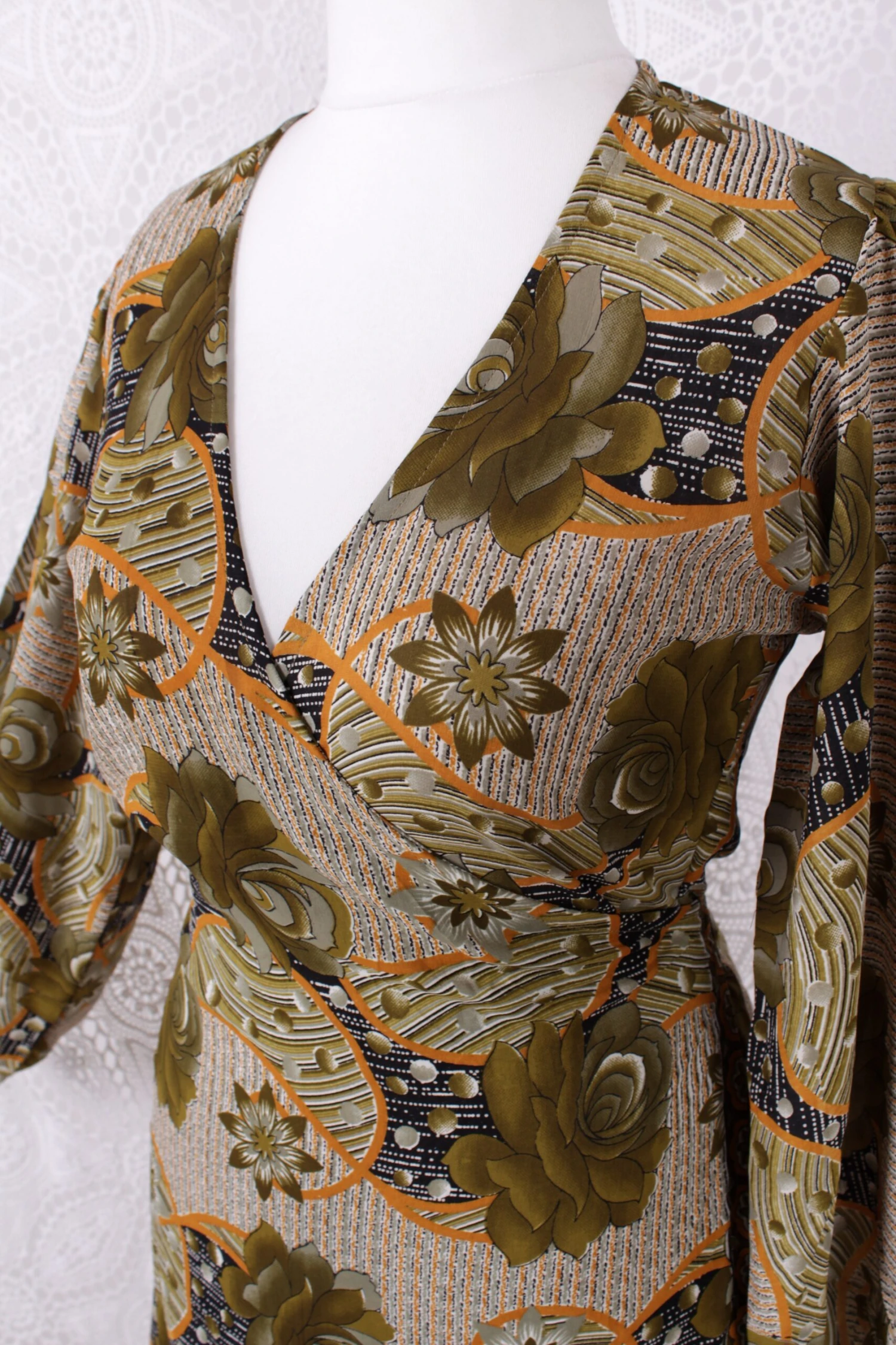 Its a wraparound dress so can be adjusted larger or smaller as you wish. It has the prettiest 70s balloon sleeve with cuff, a deep V neckline and a long straight crossover skirt.