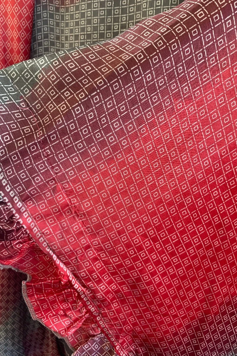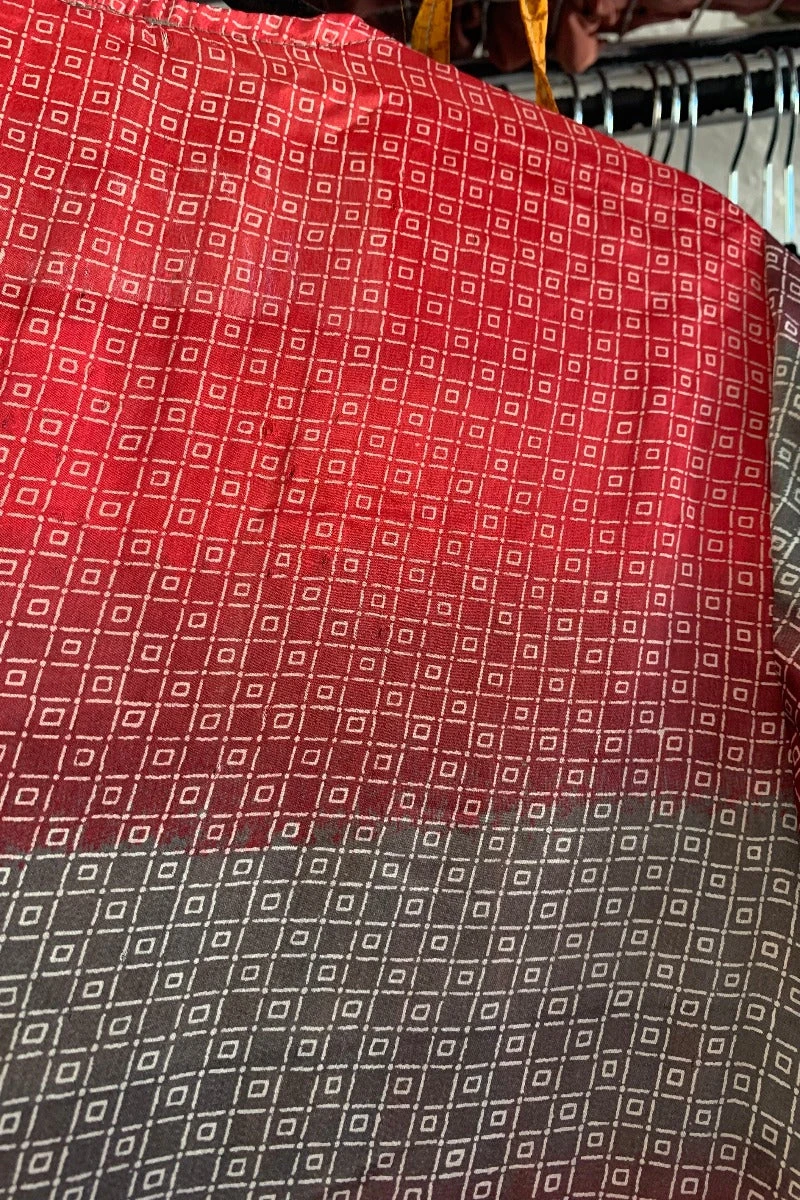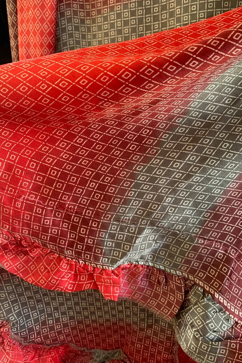 Handmade from Recycled Vintage Indian Sari – Exact Content Blend Unknown, feels silky and soft. Slightly sheer.