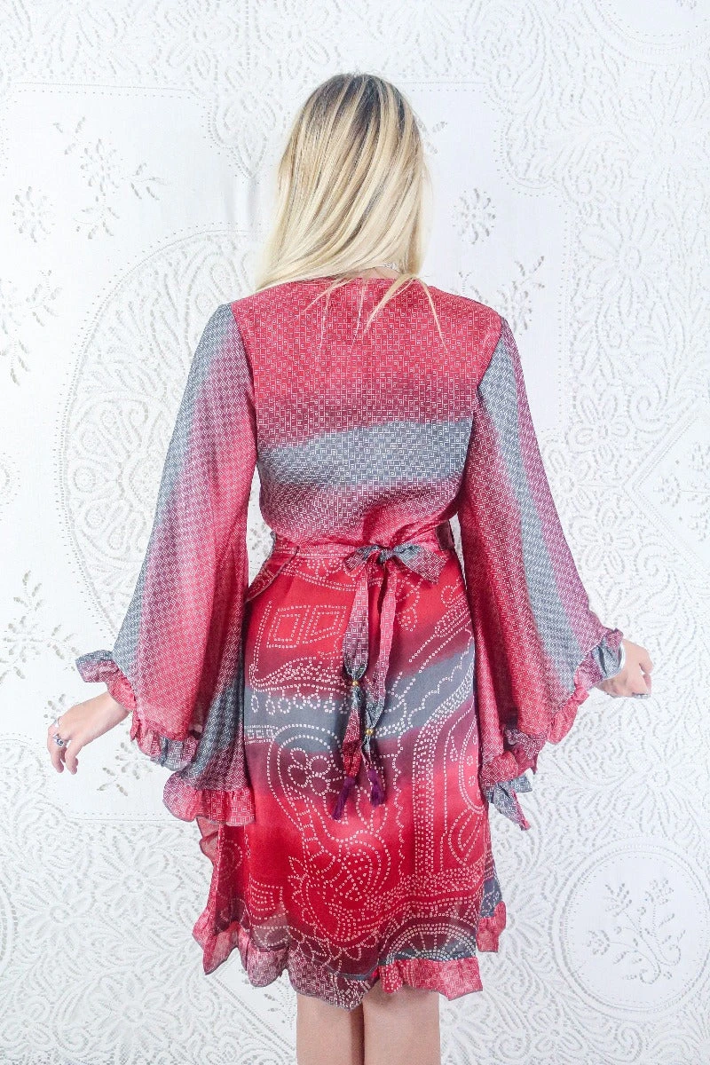 This luxurious handmade midi length wrap dress is inspired by dreamy 70s bohemia, with exaggerated frilly butterfly bell sleeves, finished by an adorable frill trim along the hem. Designed with every season in mind; wear her on her own as a dress, or style as a tunic top over a pair of vintage flares.