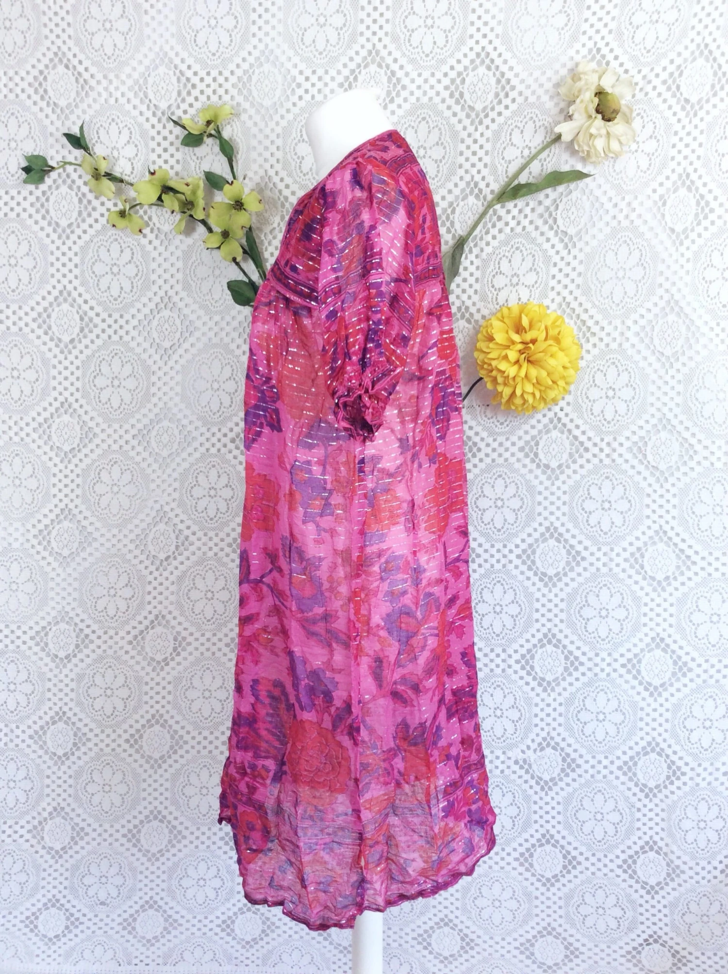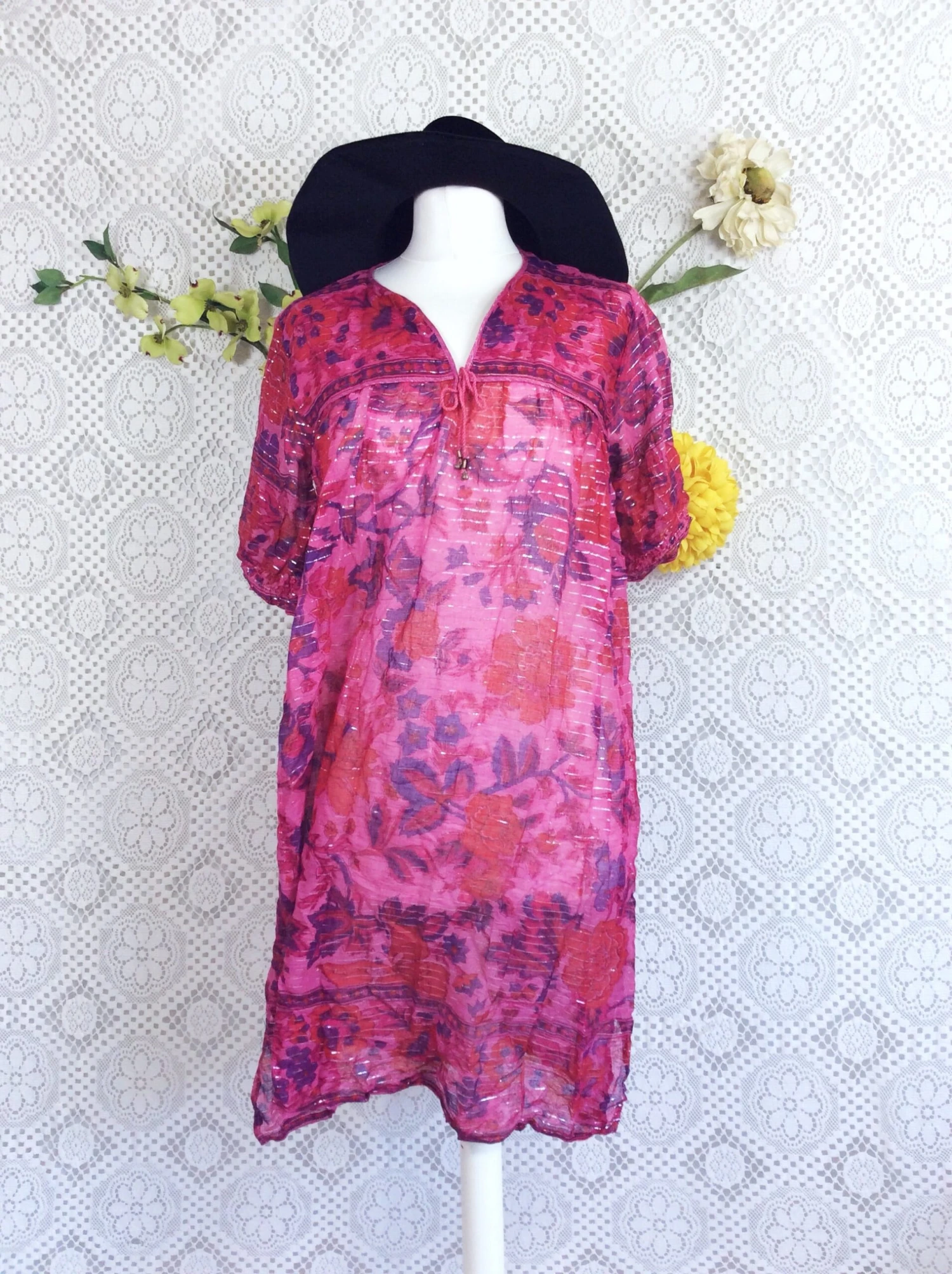Super pretty vintage cotton smock dress. Made from Indian fabrics, so they’re super soft cotton with beautiful shiny thread running through! Would be great with a bikini underneath for the beach or worn with a slip underneath in summer!