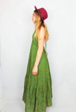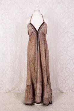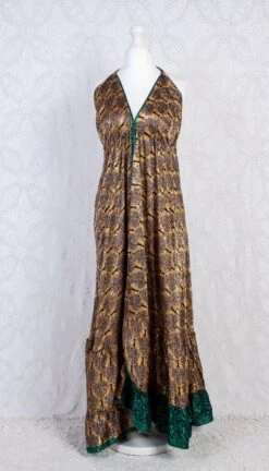 Blossom Halter Maxi Dress – Vintage Sari – Tiger Eye Stripe & Jade Lilies – Free Size M/L