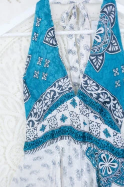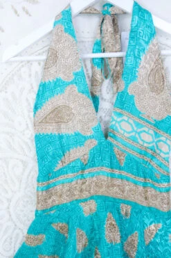 Sydney Mini Halter Dress – Silver Embroidered Apple Green Floral – Vintage Sari – S/M