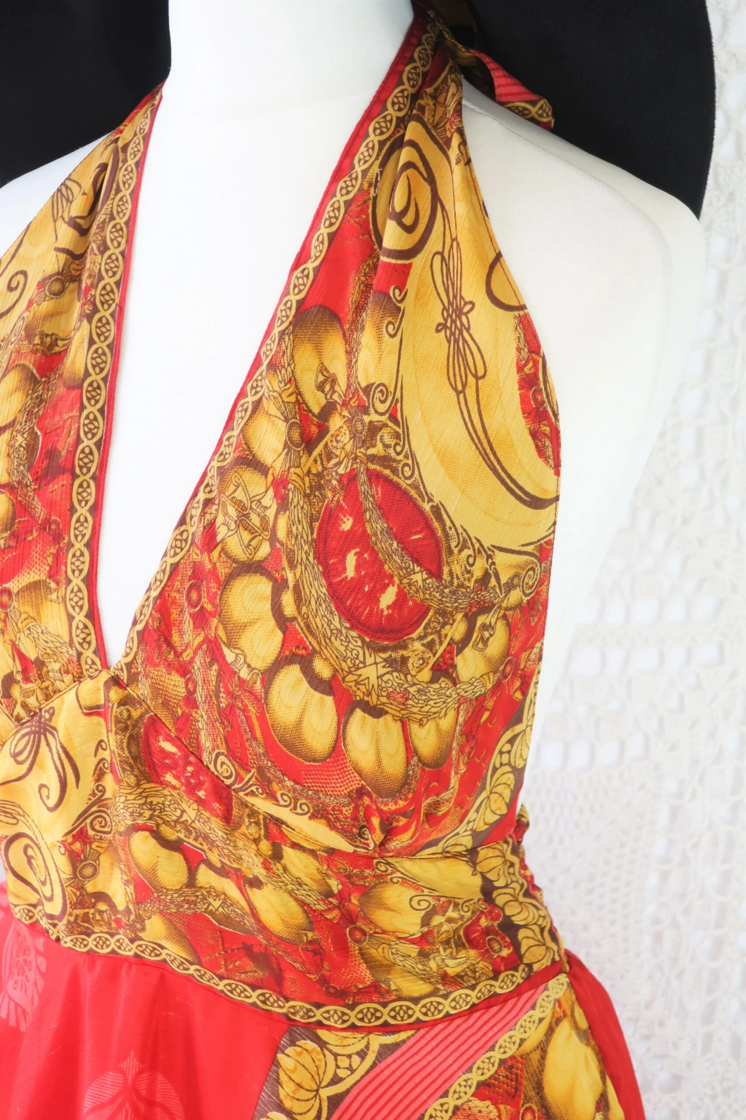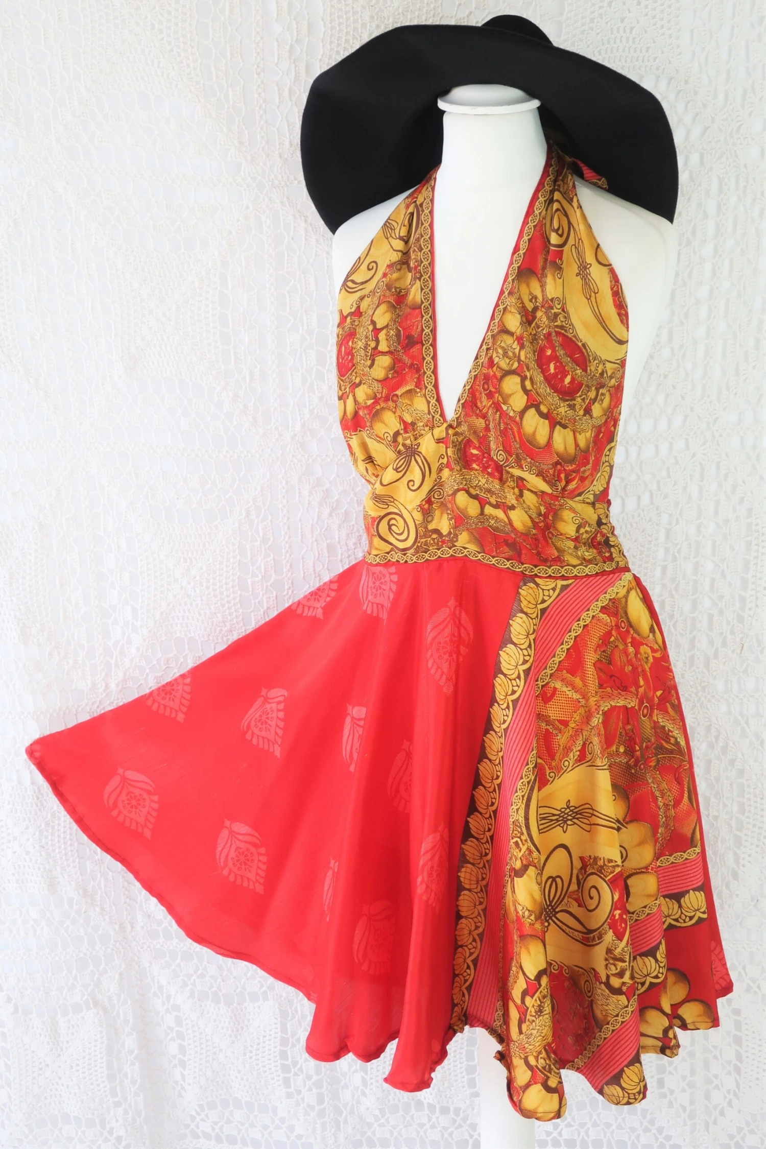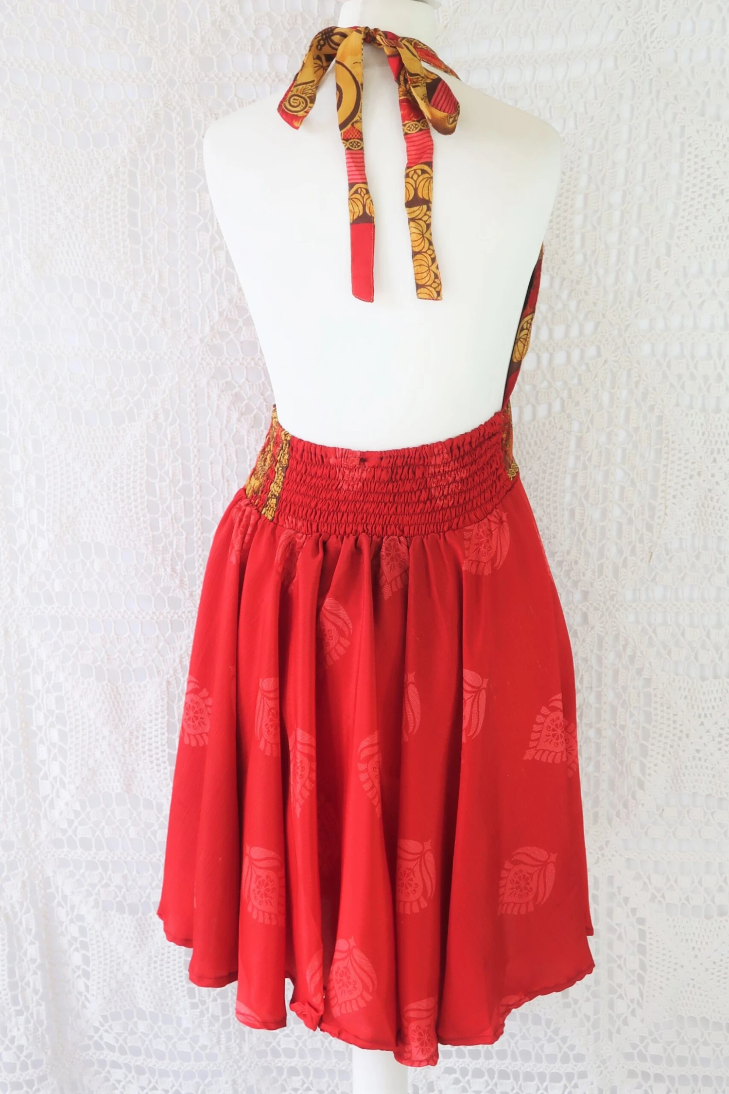 Stunning 70s boho inspired mini dress, made from vintage recycled Indian fabrics so each one is truly unique! Super soft silky sari material with a gorgeous colour and print.