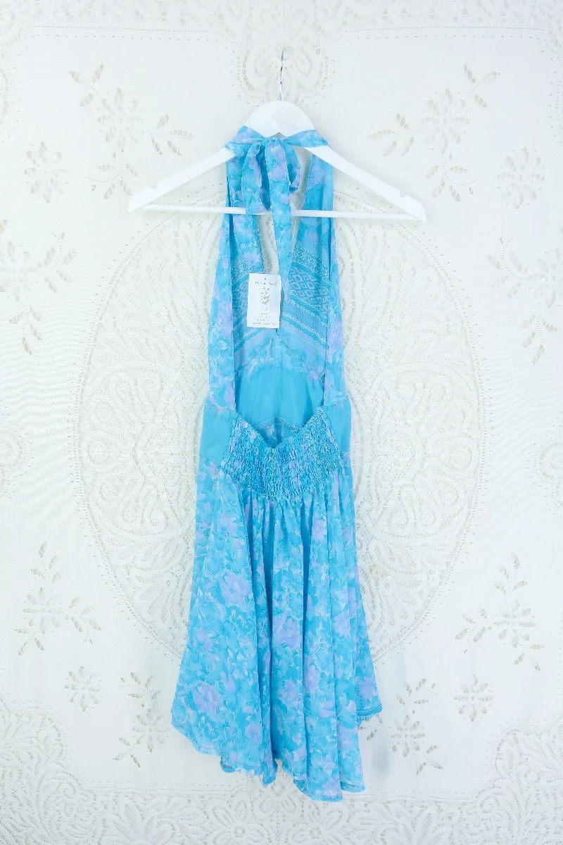 Dress can be adjusted at the neckline and has an elasticated waist and a short pretty floaty skirt.
