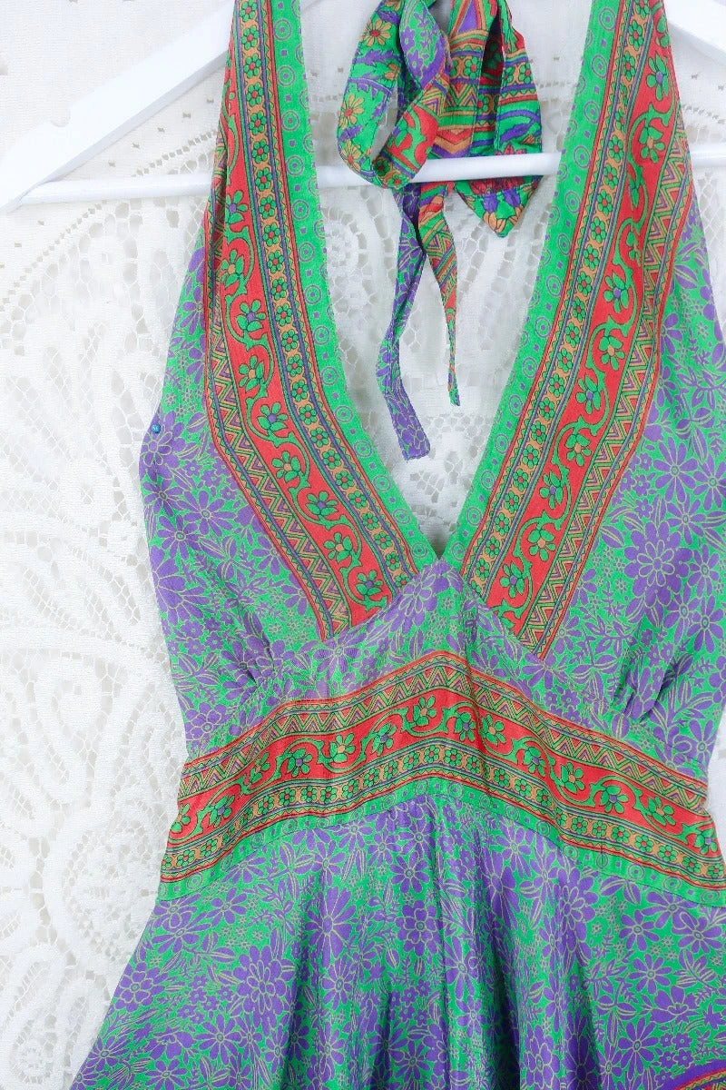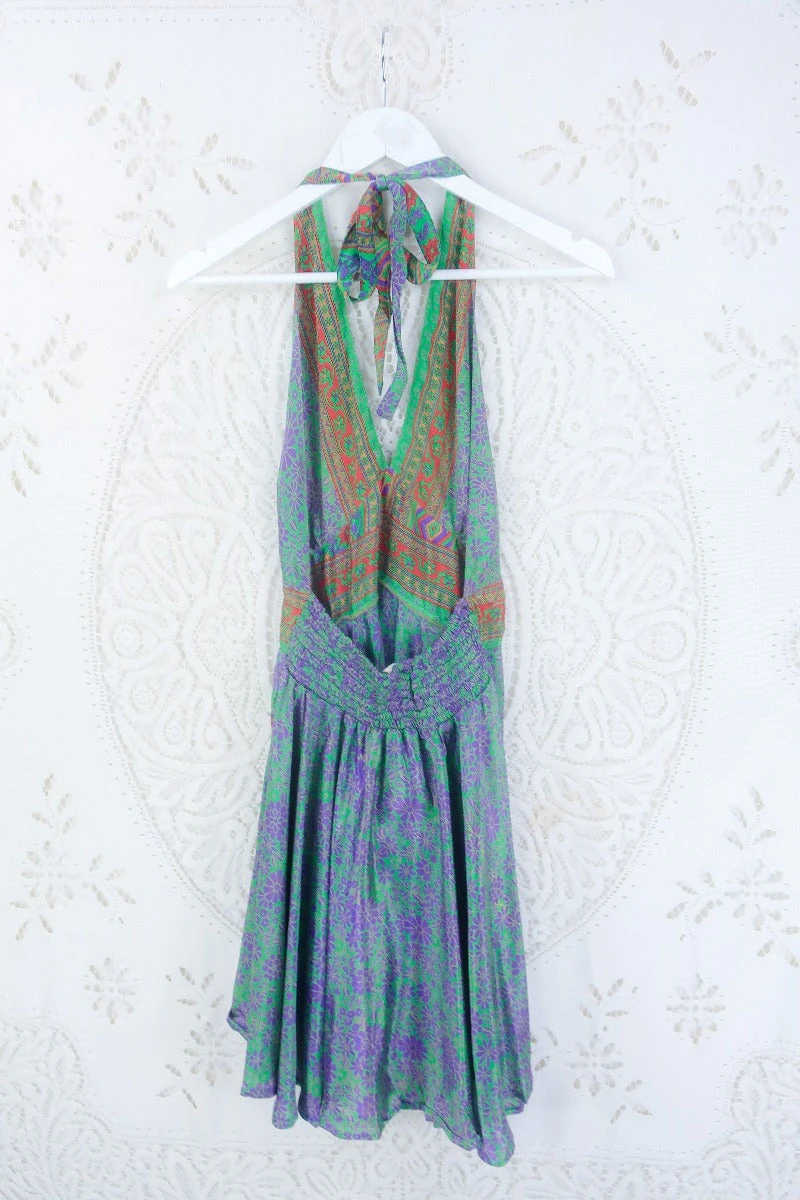 Stunning 70s boho inspired mini dress, made from vintage recycled Indian fabrics so each one is truly unique! Super soft silky sari material with a gorgeous colour and print.