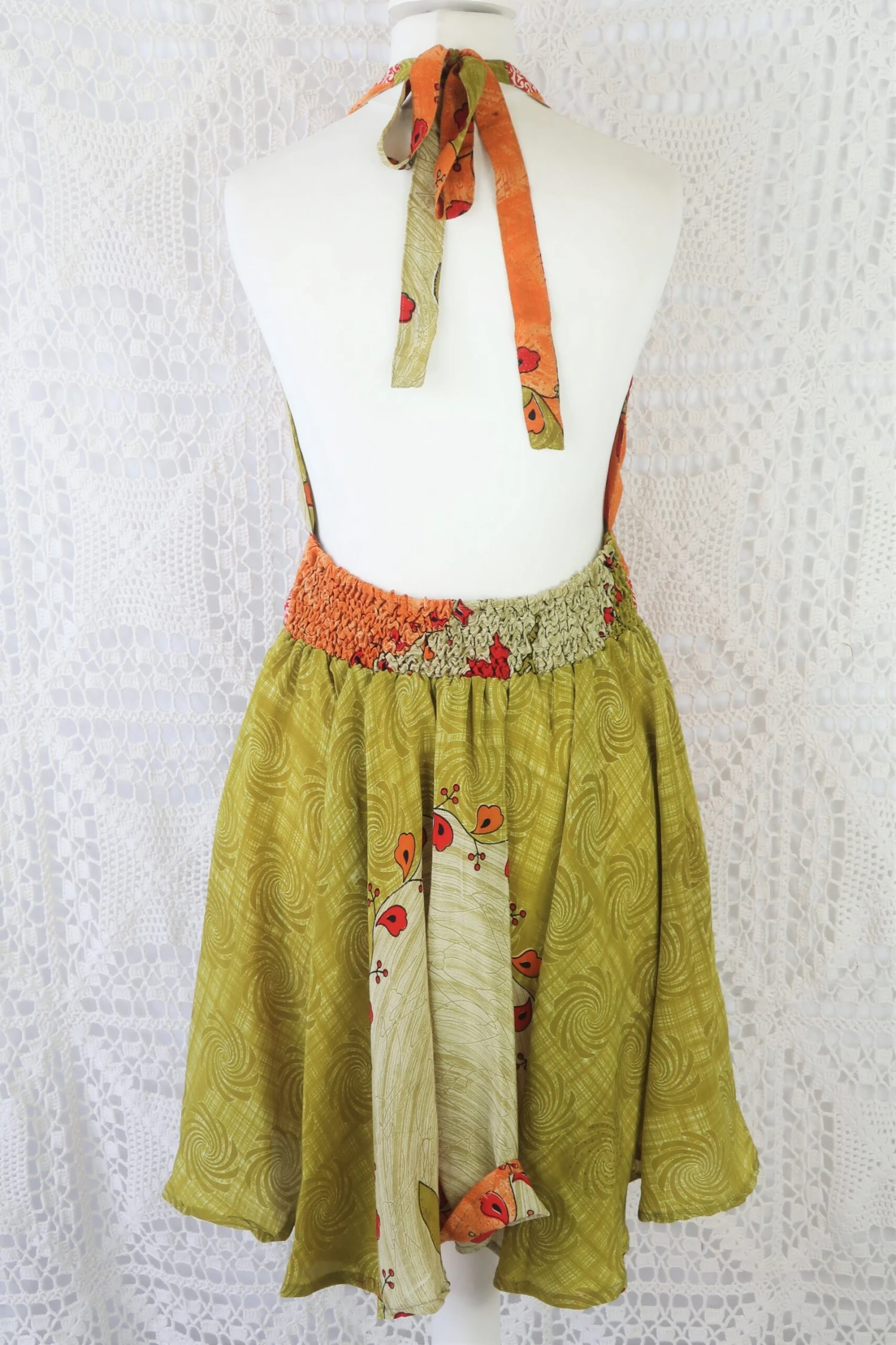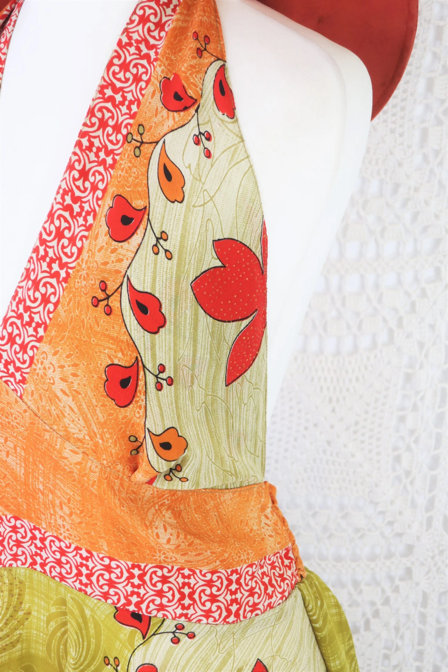 Stunning 70s boho inspired mini dress, made from vintage recycled Indian fabrics so each one is truly unique! Super soft silky sari material with a gorgeous colour and print.