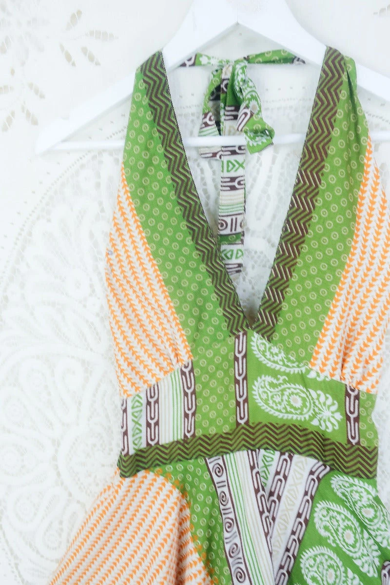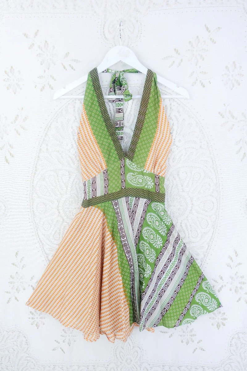 Stunning 70s boho inspired mini dress, made from vintage recycled Indian fabrics so each one is truly unique! Super soft silky sari material with a gorgeous colour and print.