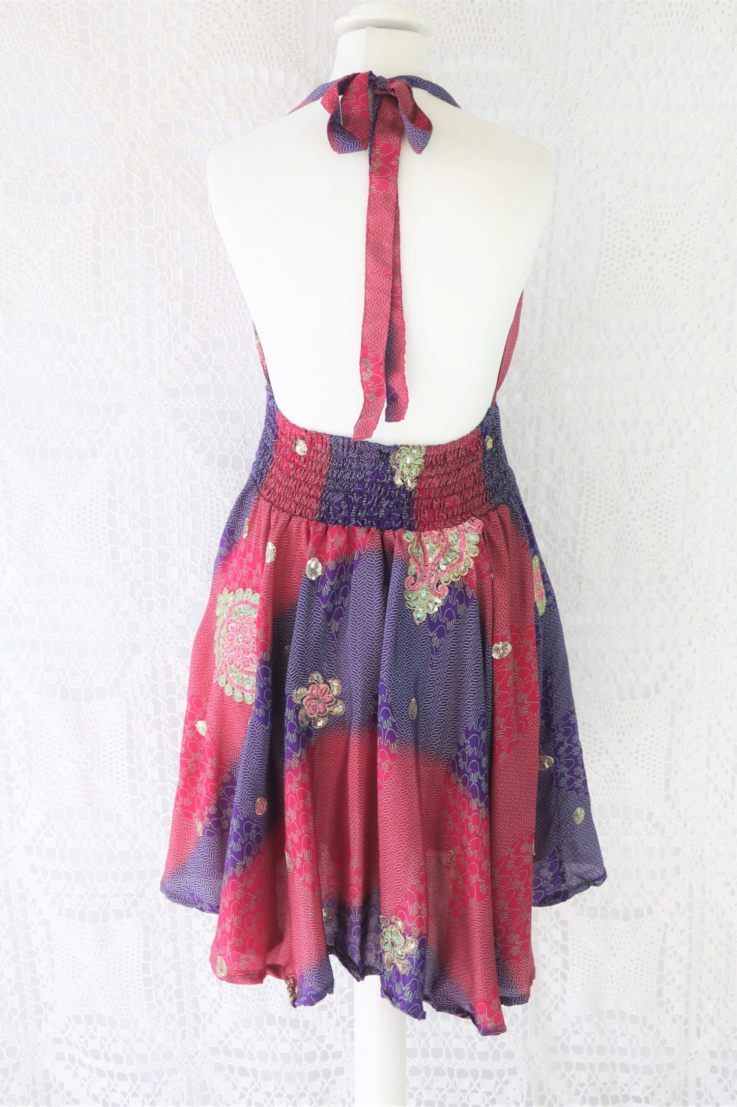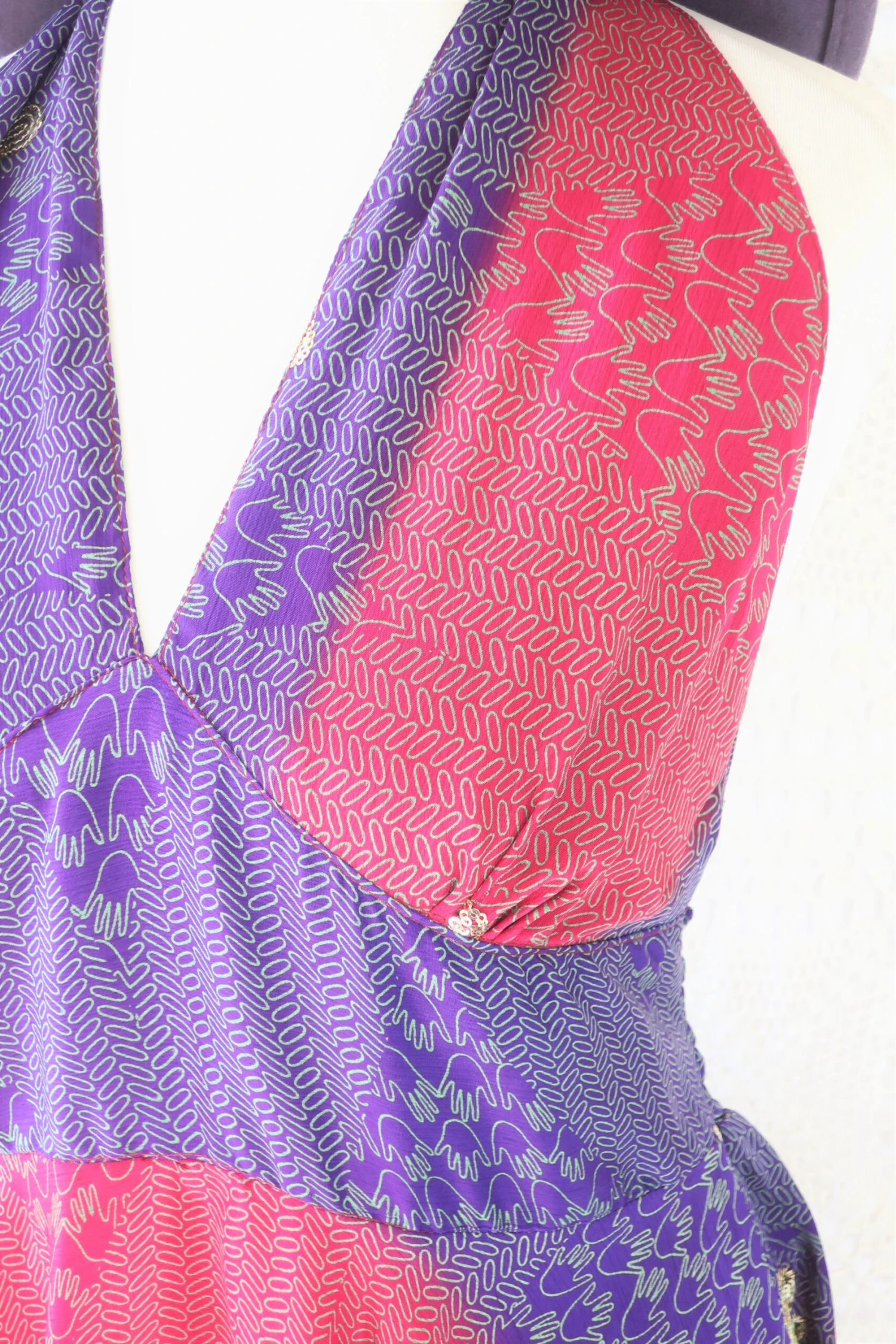 Stunning 70s boho inspired mini dress, made from vintage recycled Indian fabrics so each one is truly unique! Super soft silky sari material with a gorgeous colour and print.