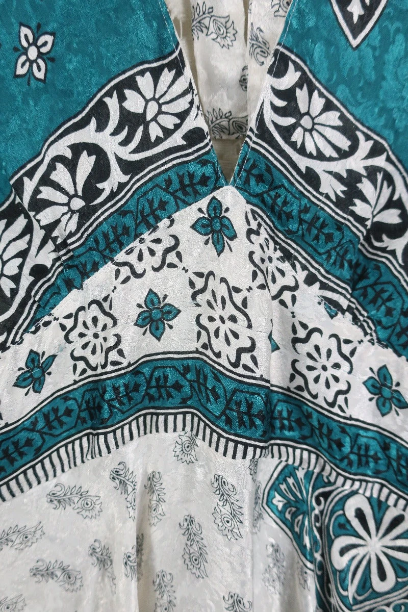 Stunning 70s boho inspired mini dress, made from vintage recycled Indian fabrics so each one is truly unique!Ā Super soft silky sari material with a gorgeous colour and print.