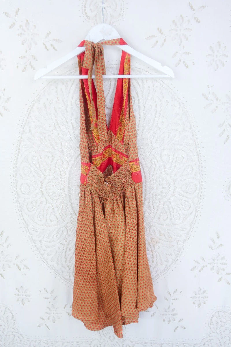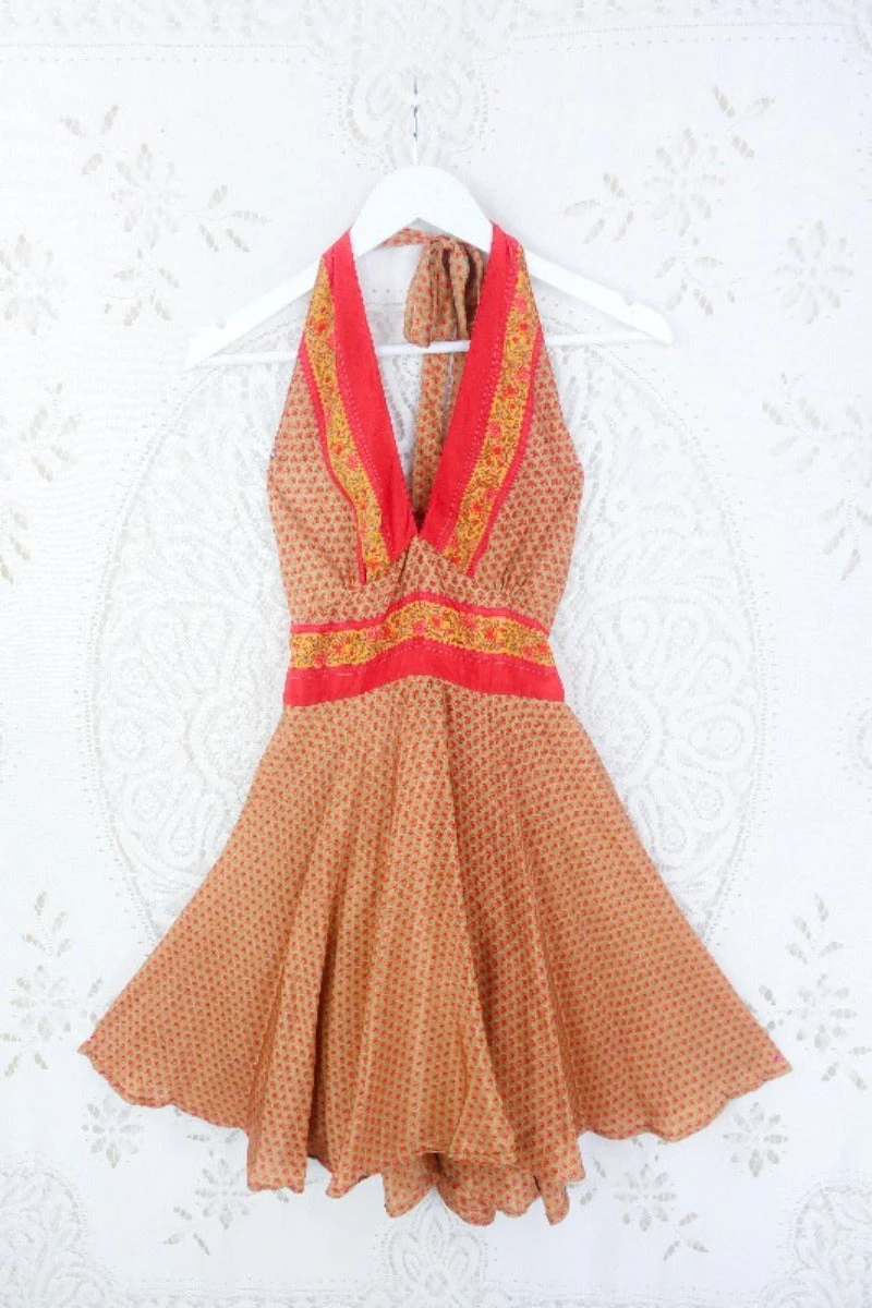 Stunning 70s boho inspired mini dress, made from vintage recycled Indian fabrics so each one is truly unique! Super soft silky sari material with a gorgeous colour and print.