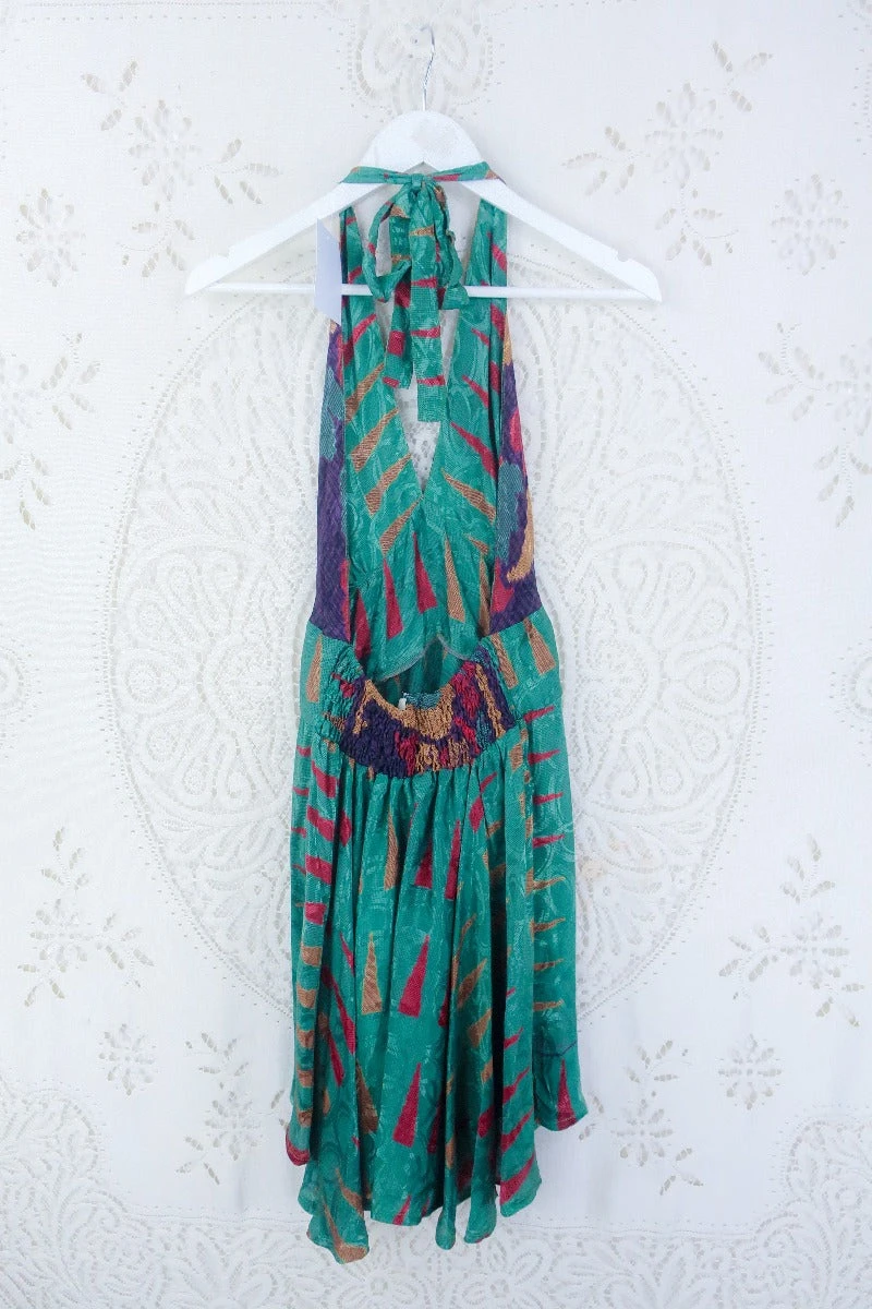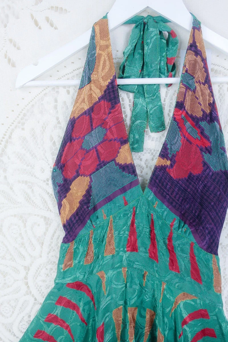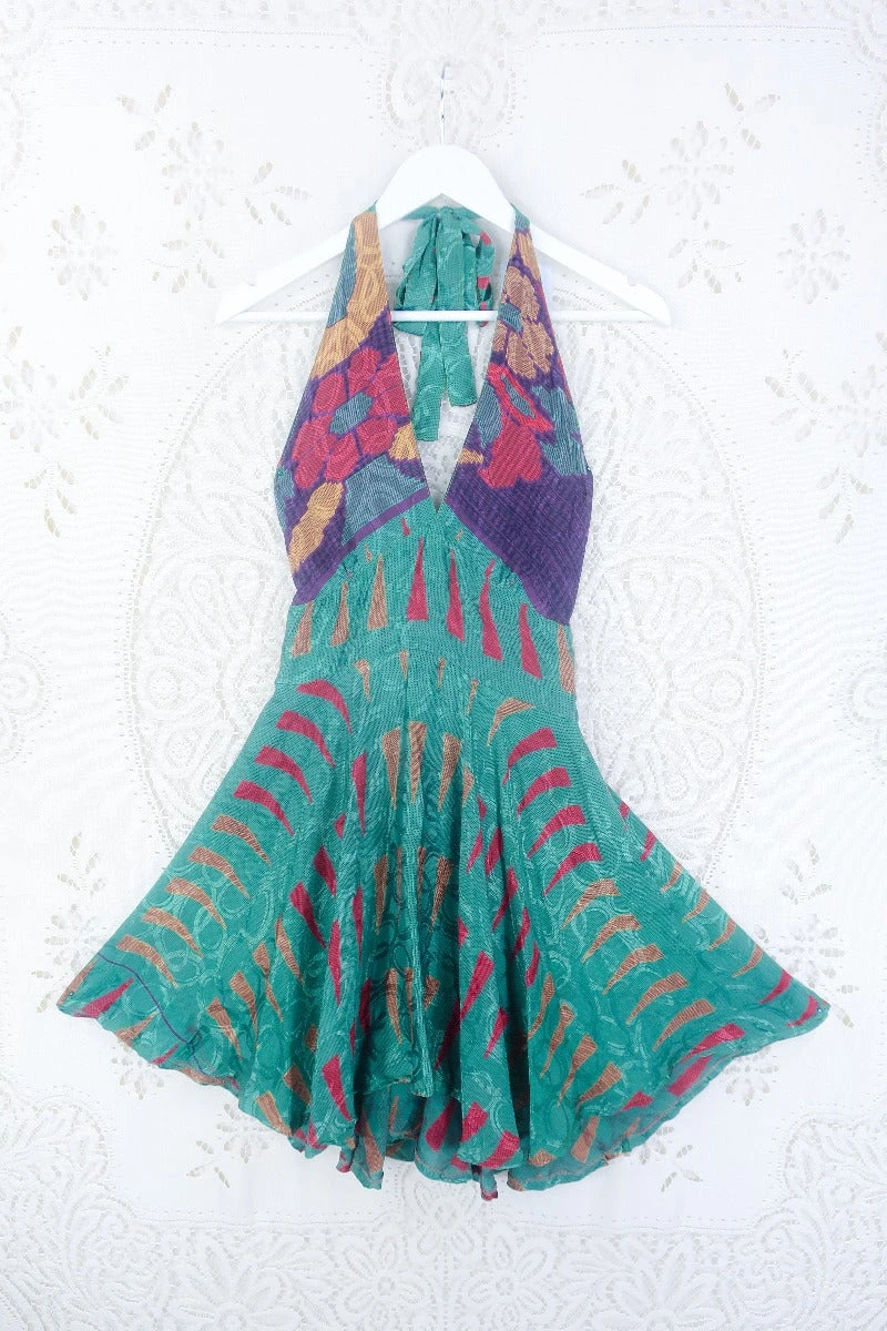 Stunning 70s boho inspired mini dress, made from vintage recycled Indian fabrics so each one is truly unique! Super soft silky sari material with a gorgeous colour and print.
