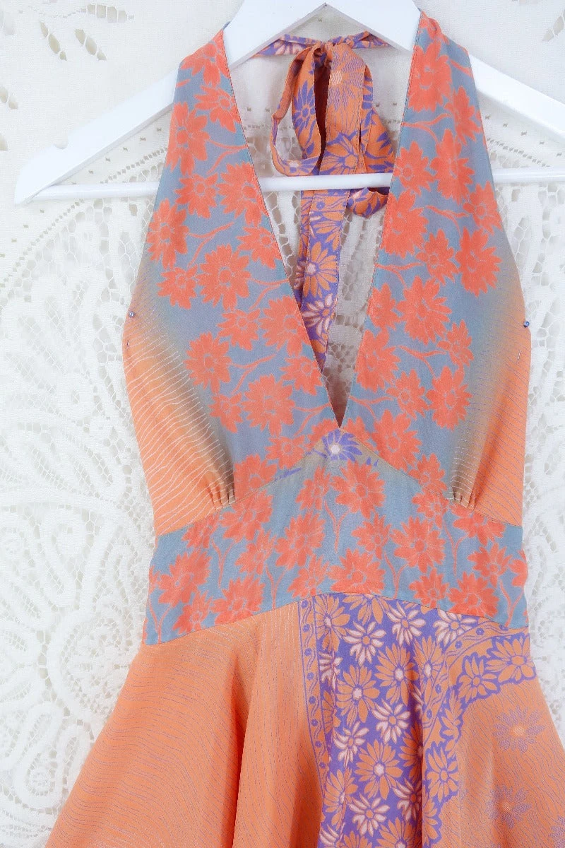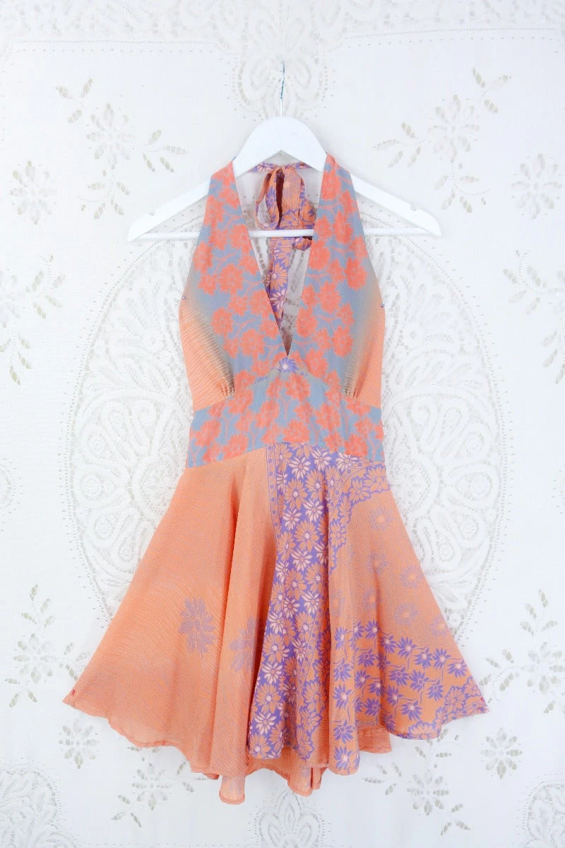 Stunning 70s boho inspired mini dress, made from vintage recycled Indian fabrics so each one is truly unique! Super soft silky sari material with a gorgeous colour and print.