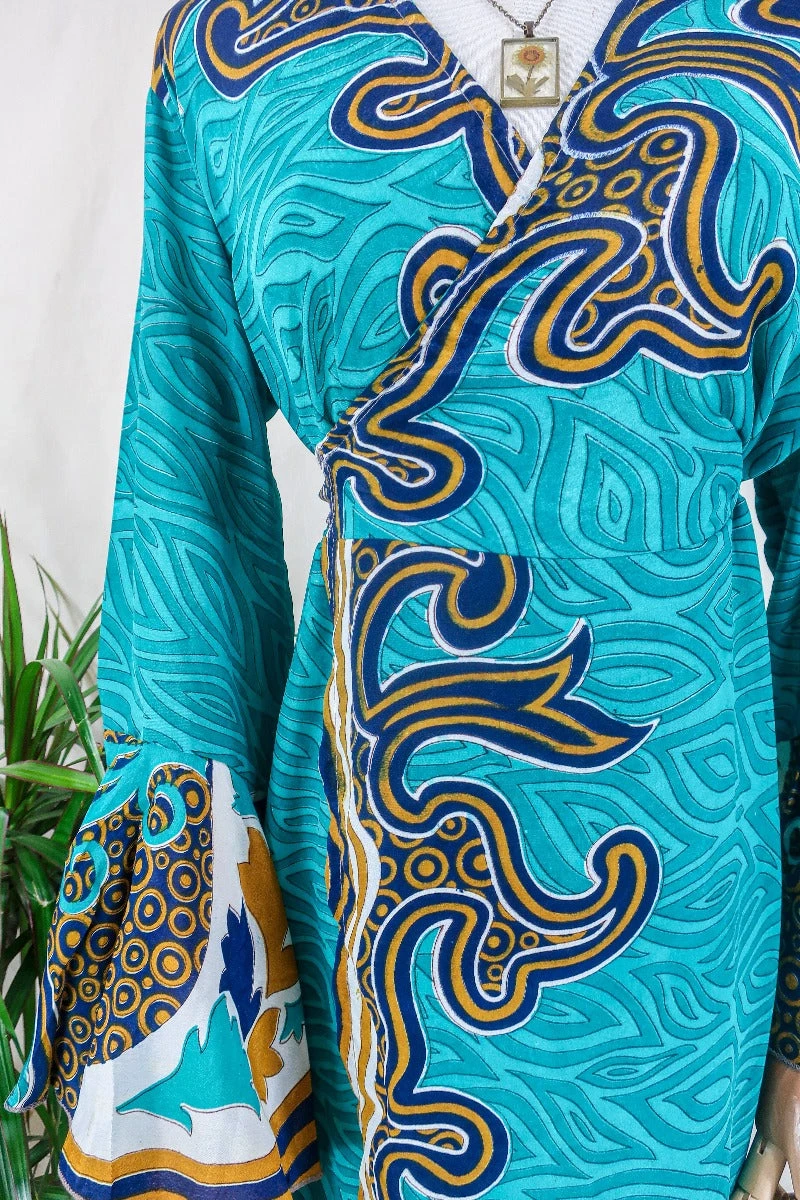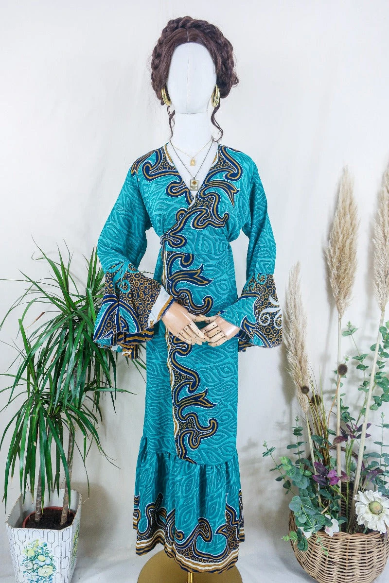 Sylvia Wrap Dress – Teal And Mustard Abstract Leaf – Vintage Sari – Size L/XL