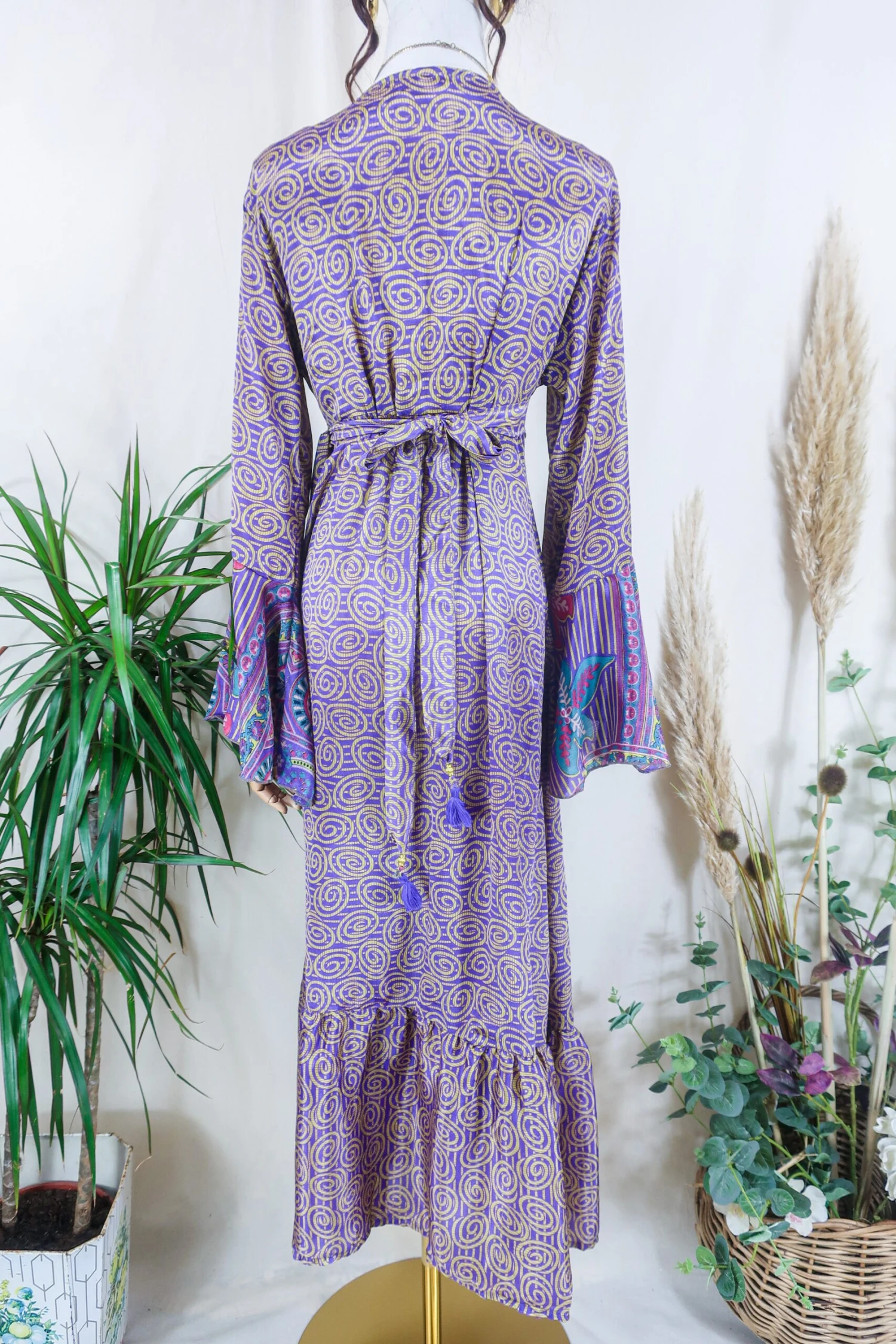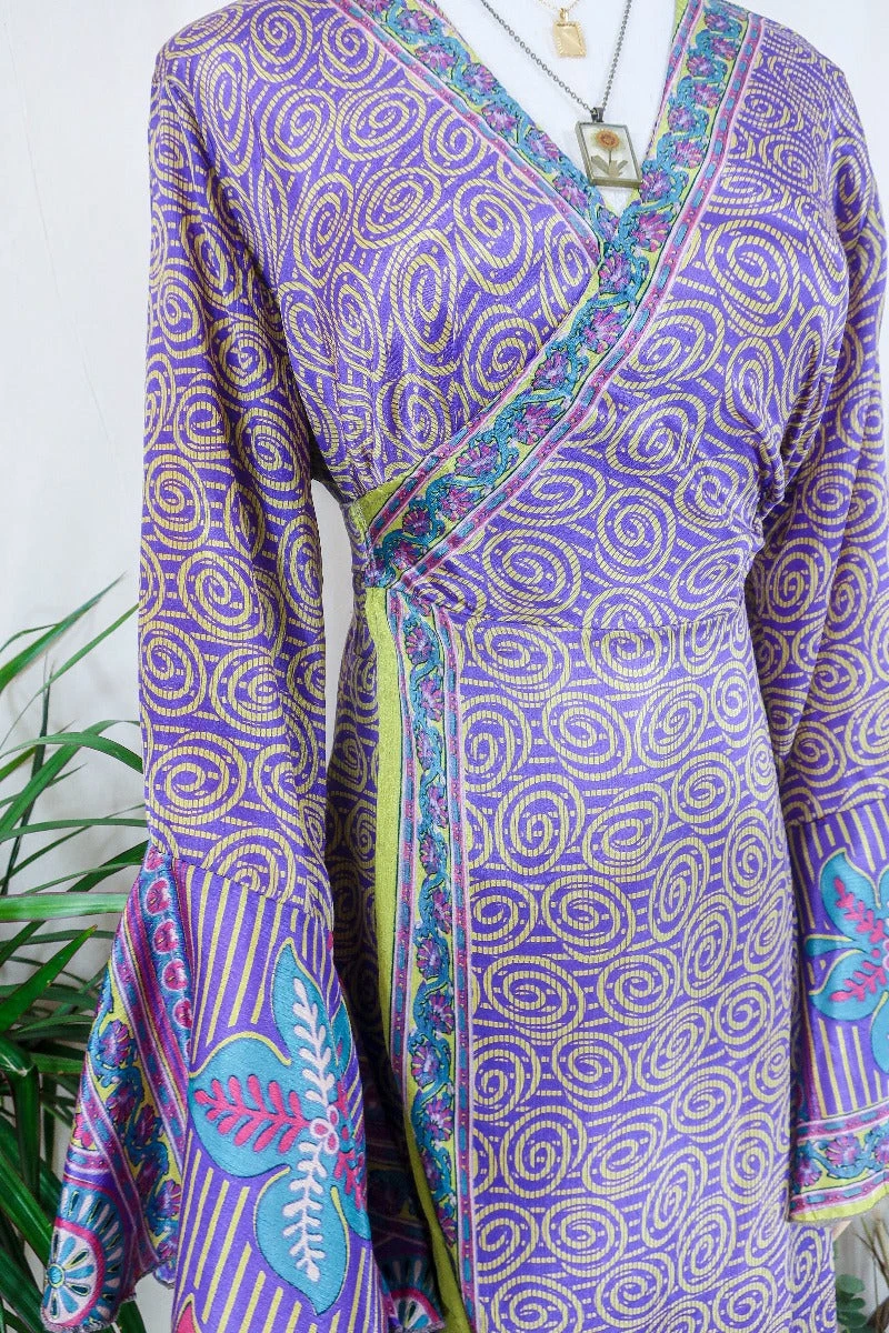 Sylvia Wrap Dress – Violet And Pistachio Swirl – Vintage Sari – Size L/XL