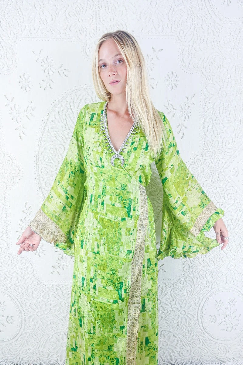 This luxurious handmade midi length wrap dress is inspired by dreamy 70s bohemia, with exaggerated frilly butterfly bell sleeves, a svelte fitted waist and skirt. Designed with every season in mind; wear in the summer on it’s own or layer up in the colder months.