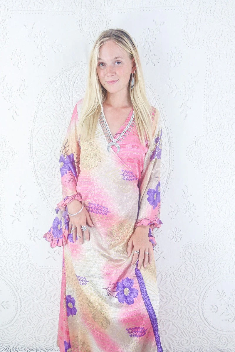 This luxurious handmade midi length wrap dress is inspired by dreamy 70s bohemia, with exaggerated frilly butterfly bell sleeves and a svelte fitted waist and skirt. Designed with every season in mind; wear in the summer on it’s own or layer up in the colder months.