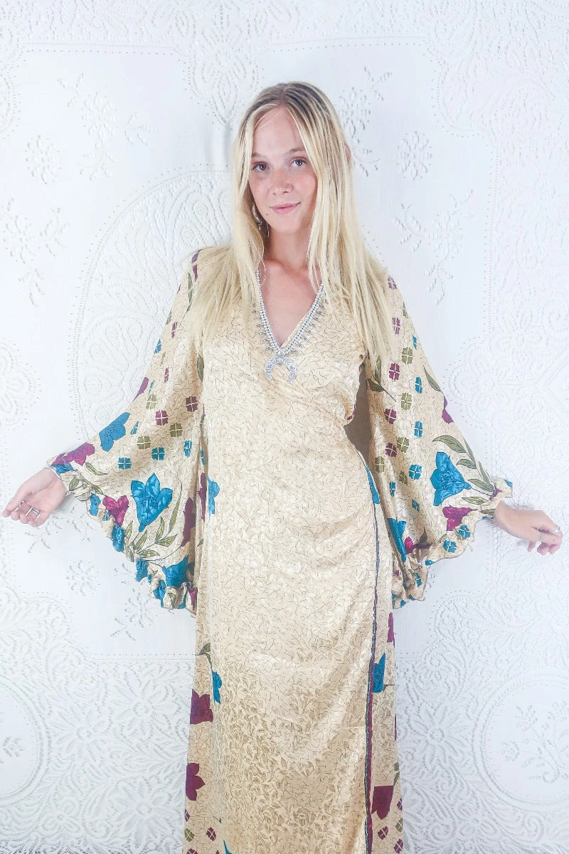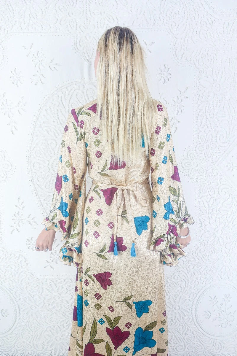 This luxurious handmade midi length wrap dress is inspired by dreamy 70s bohemia, with exaggerated frilly butterfly bell sleeves, a svelte fitted waist and skirt. Designed with every season in mind; wear in the summer on it’s own or layer up in the colder months.Â