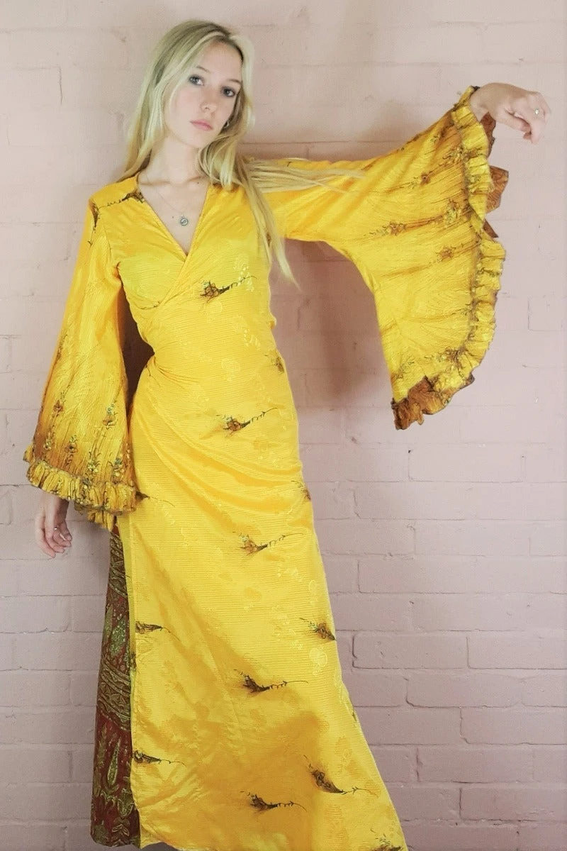 This fabulous wrap dress features a fitted tie-waist body with v-neckline and our famous exaggerated bell sleeves, finished with frilled cuffs. Handmade in lightweight recycled vintage fabrics, This dress looks wonderful accessorised with our boho jewellery and styled for a stunning & super glamorous outfit!