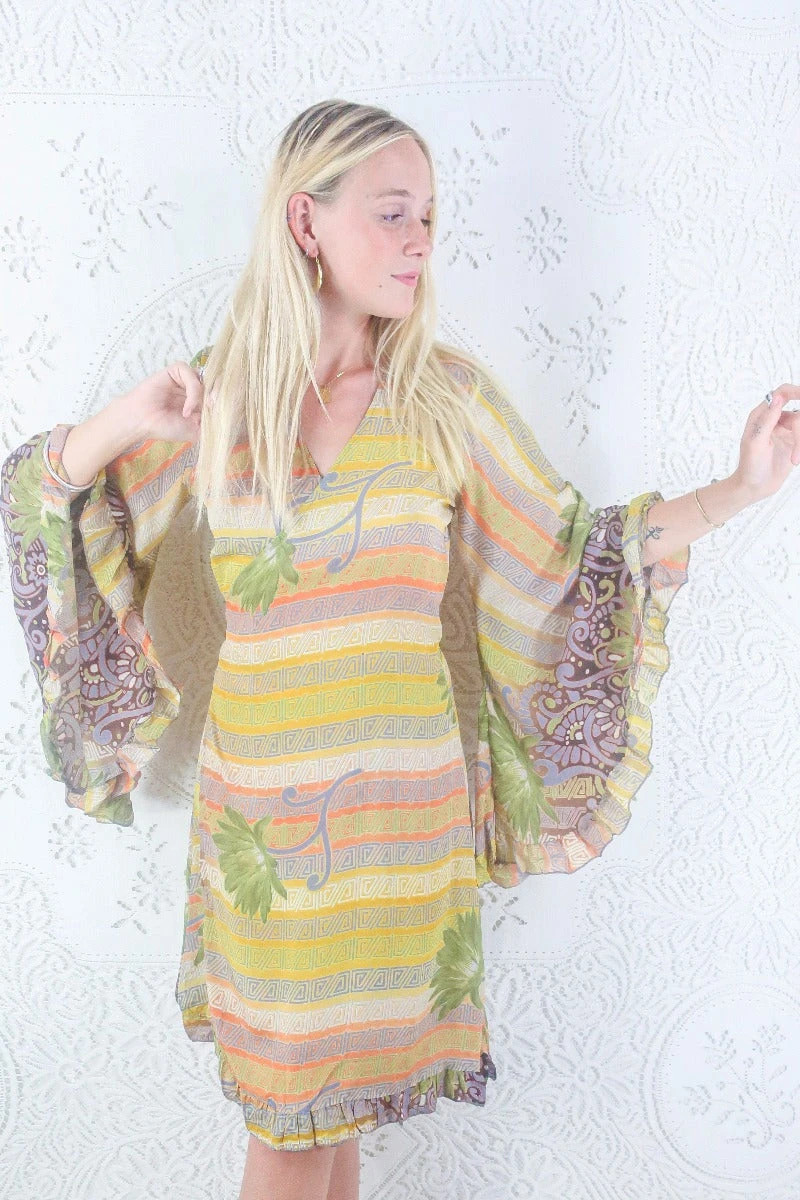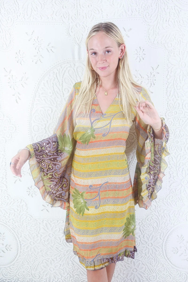 This luxurious handmade midi length wrap dress is inspired by dreamy 70s bohemia, with exaggerated frilly butterfly bell sleeves, finished by an adorable frill trim along the hem. Designed with every season in mind; wear her on her own as a dress, or style as a tunic top over a pair of vintage flares.