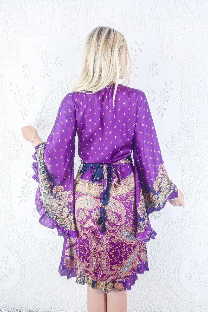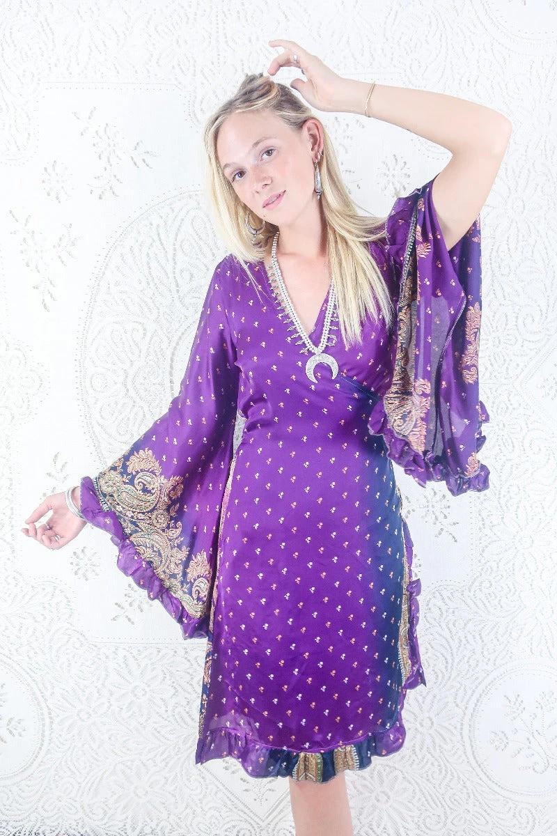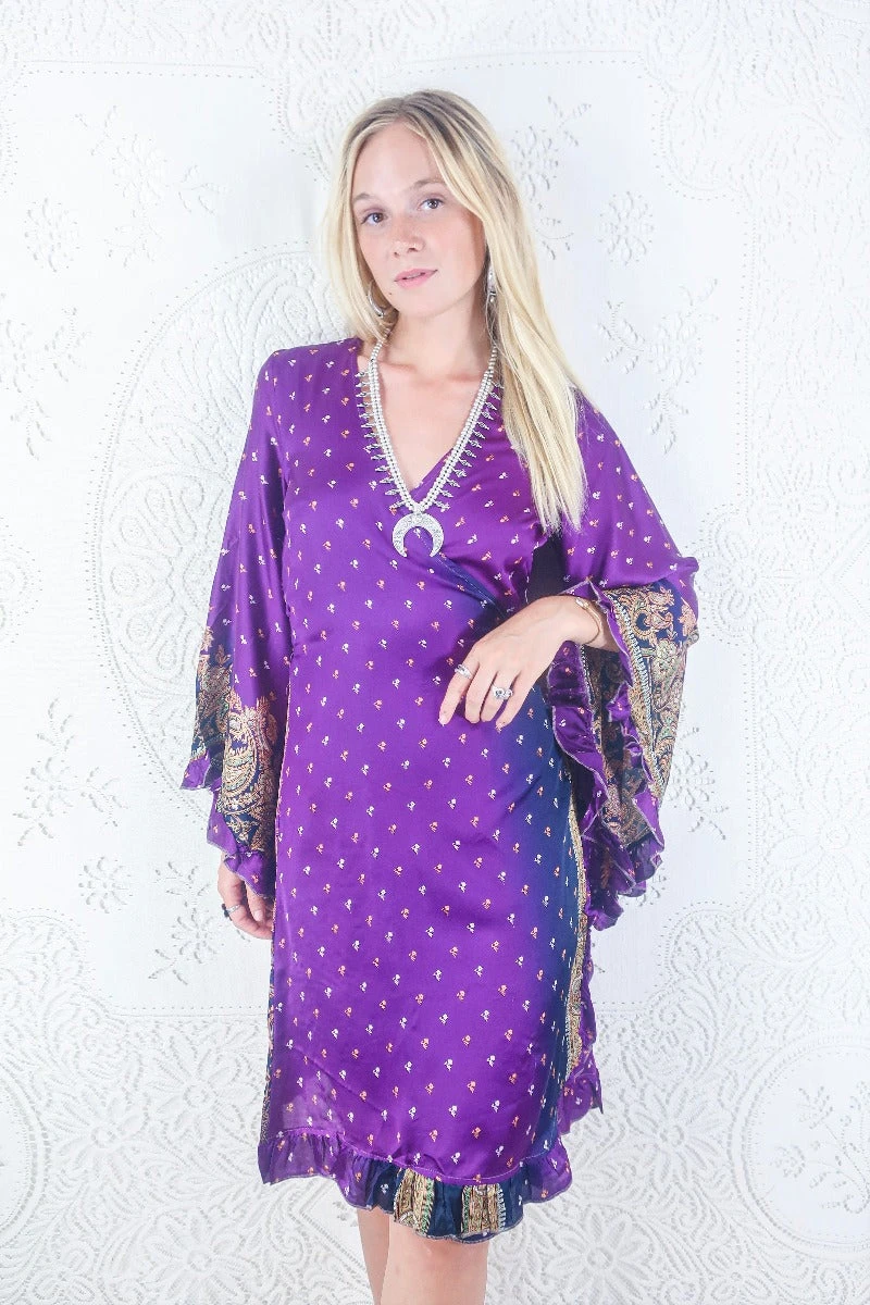 This luxurious handmade midi length wrap dress is inspired by dreamy 70s bohemia, with exaggerated frilly butterfly bell sleeves, finished by an adorable frill trim along the hem. Designed with every season in mind; wear her on her own as a dress, or style as a tunic top over a pair of vintage flares.
