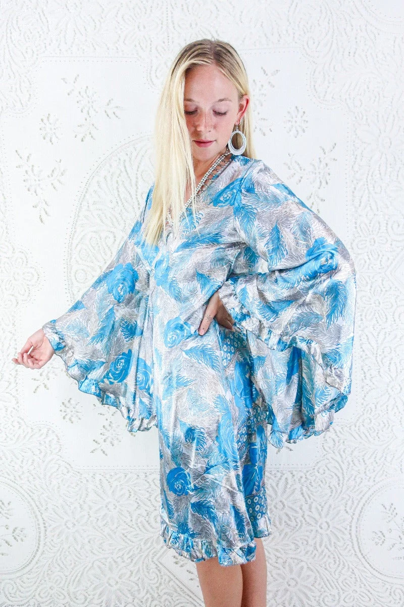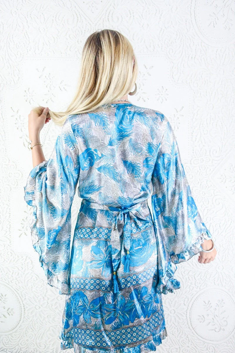 This luxurious handmade midi length wrap dress is inspired by dreamy 70s bohemia, with exaggerated frilly butterfly bell sleeves, finished by an adorable frill trim along the hem. Designed with every season in mind; wear her on her own as a dress, or style as a tunic top over a pair of vintage flares.