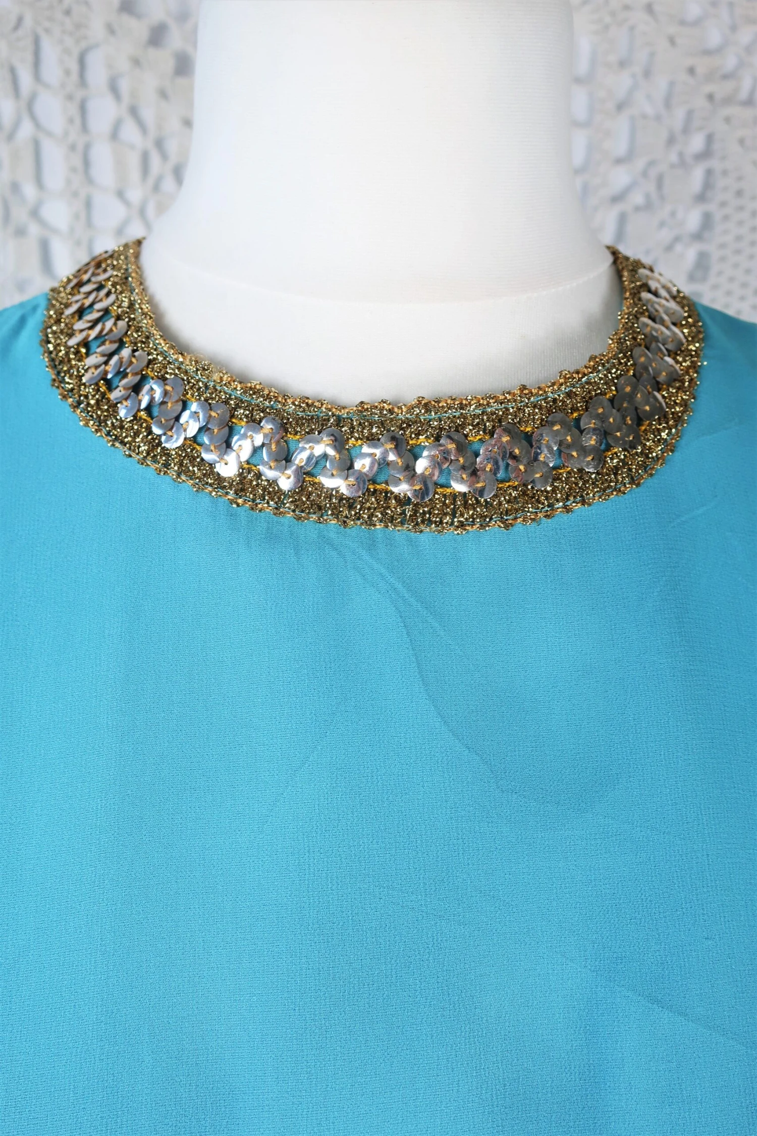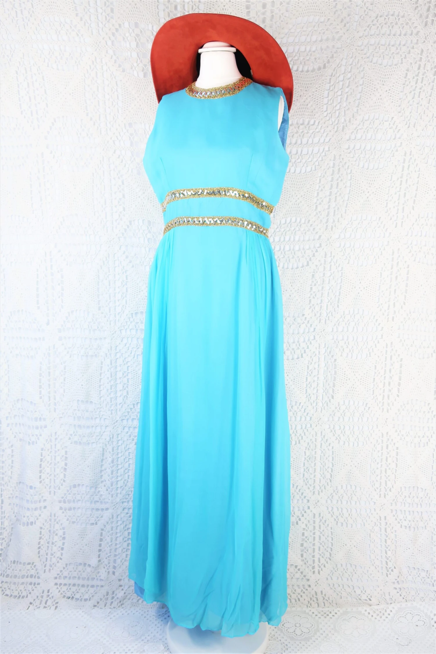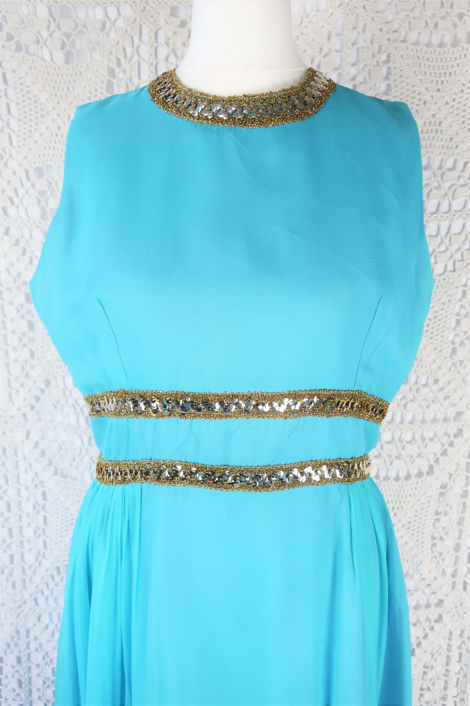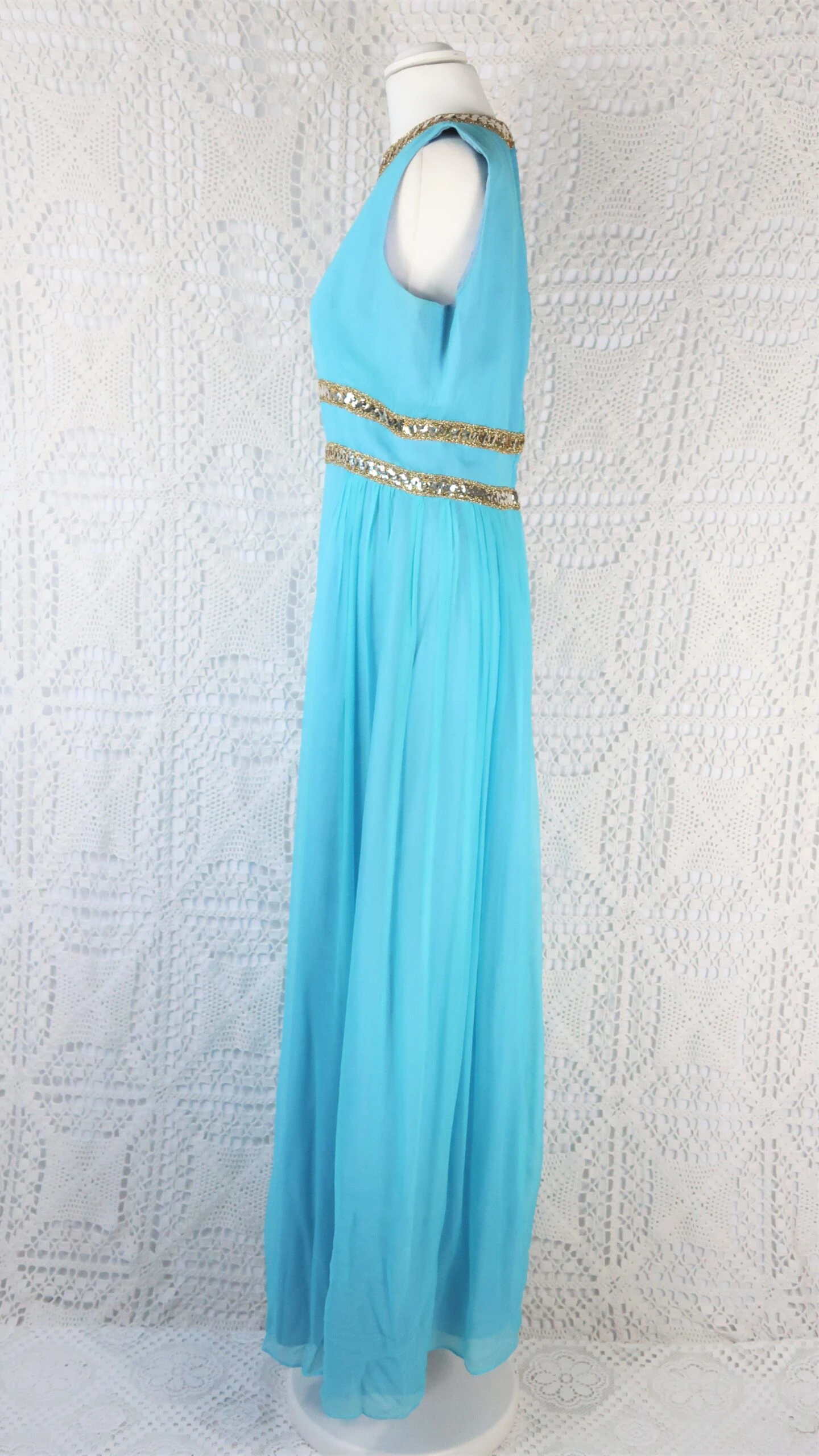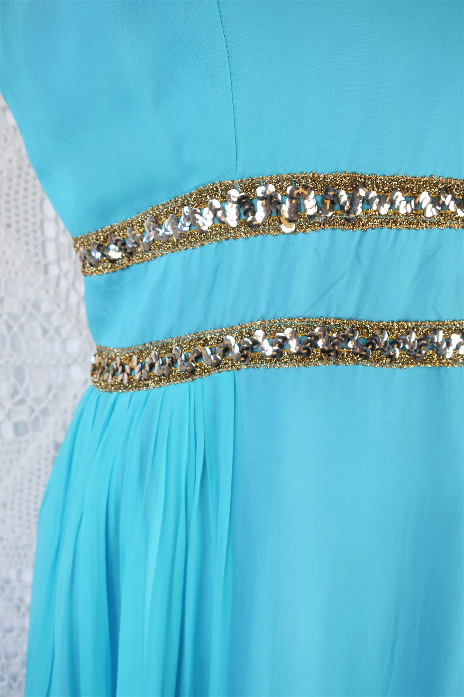Gorgeous vibrant blue vintage prom style maxi dress with golden sequin embellishment. A perfect party dress!
