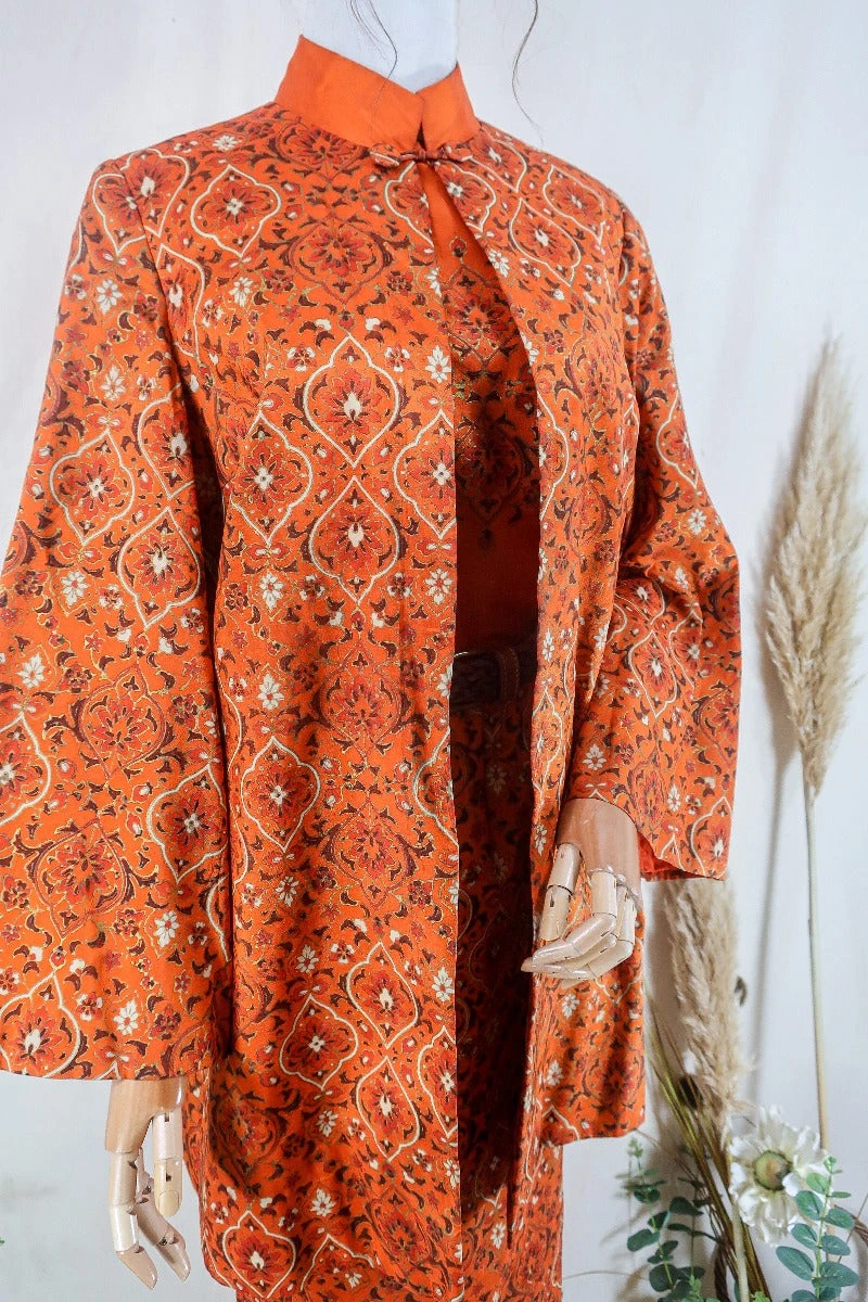 This stunning 1960’s Co-Ord jacket and dress set is super funky and retro. The jacket has a singular button detail at the neckline, and trumpet sleeves. The dress has a fitted torso, and boat neck. This may be the perfect winter wedding guest attire!