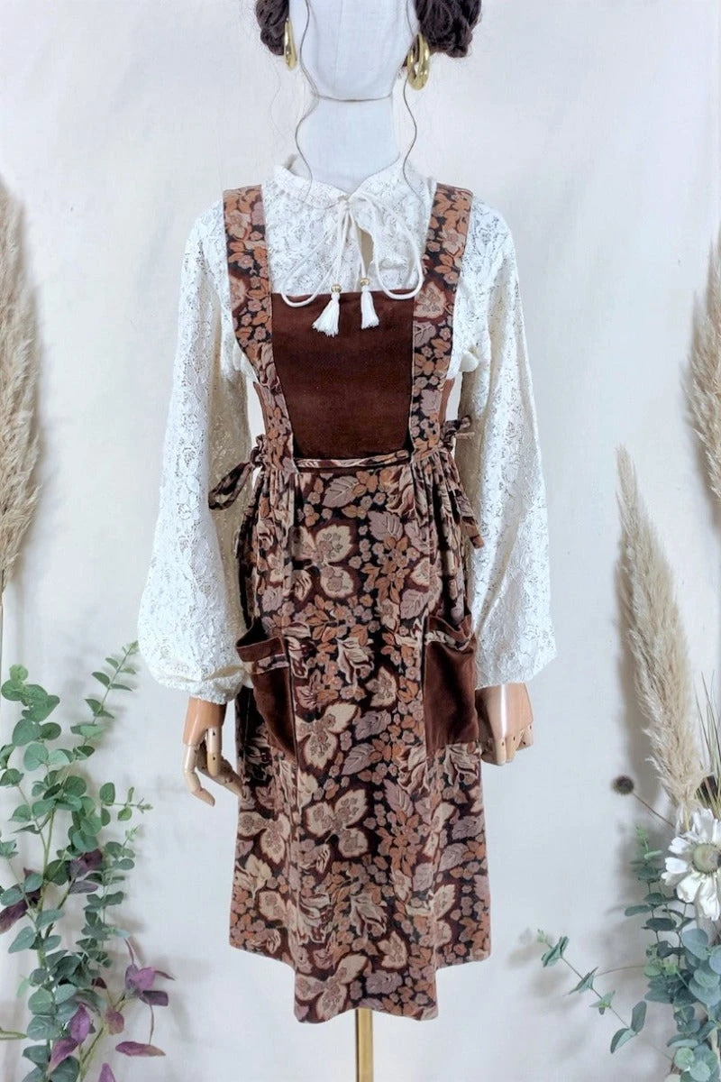 This beautiful 1970’s pinafore dress, made from a autumnal leaves patterned velvet, with chestnut toned velvet panelling. the Dress also features a waist tie belt and square pockets. Pair this stunning item with your favourite cotton blouse, and chunky wool cardigan for ultimate cottage core vibes.