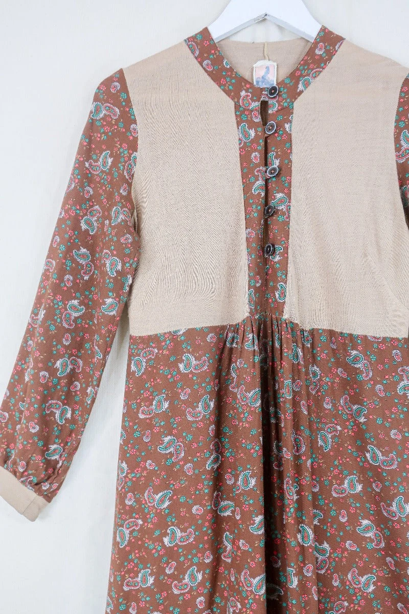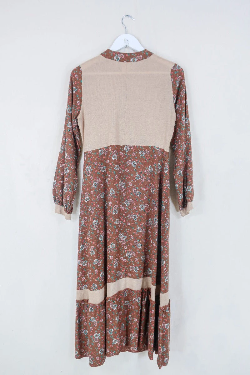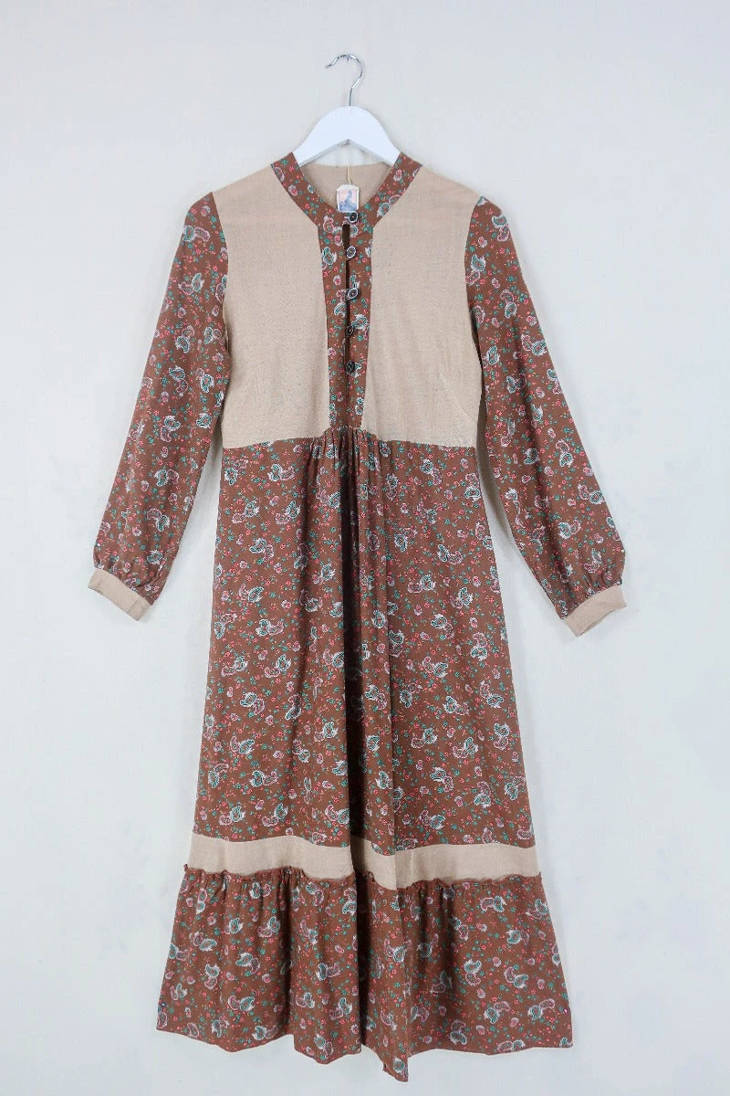 This 1970’s midi dress is the perfect autumnal cottage core staple! With long sleeves to keep you warm, and button detailing running along the torso. Pair this beauty layered with your favourite roll neck and some chunky boots for a casual boho look.