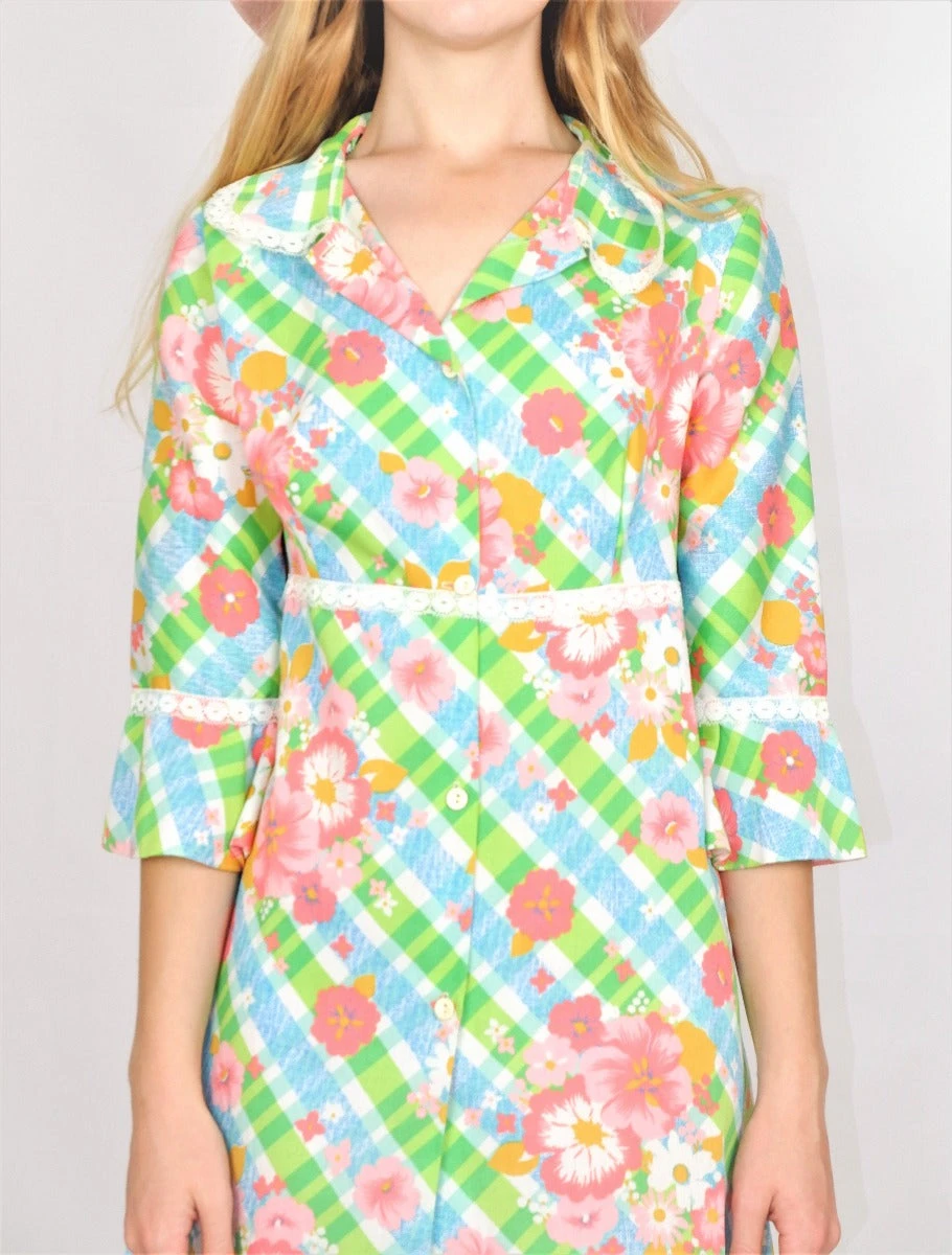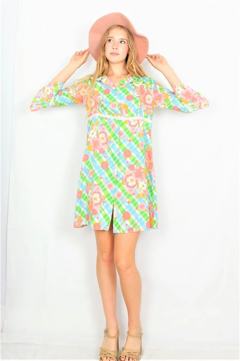 A cute vintage shift button up mini dress with in a vibrant lime, sky and pink retro print, sweet lace trim detailing, elegant fitted shape with a slight flounce sleeve – would make a super pretty party dress!