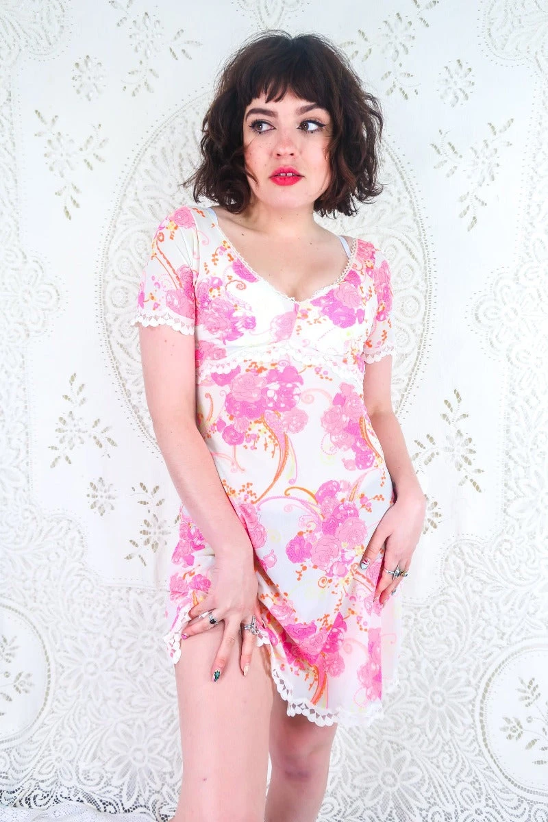 The prettiest colourful mini slip dress with a retro floral print in bright pink and yellow tones. Featuring a sweetheart neckline and lace trim detailing, it’s perfect for those summer days or could be worn as cute sleepwear!