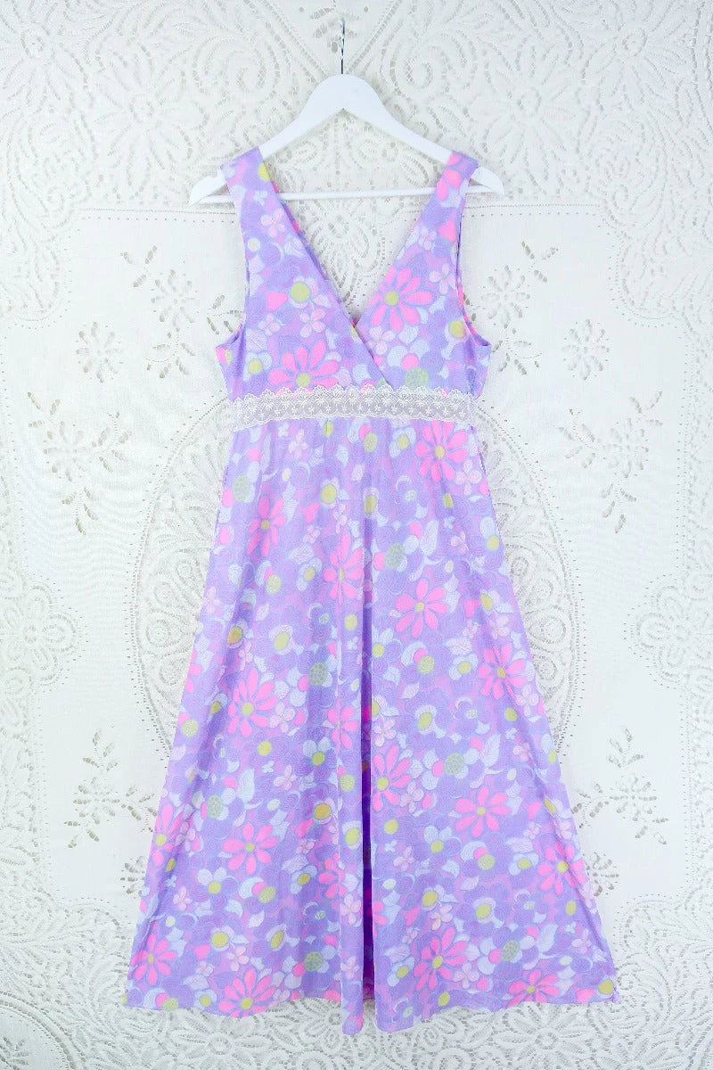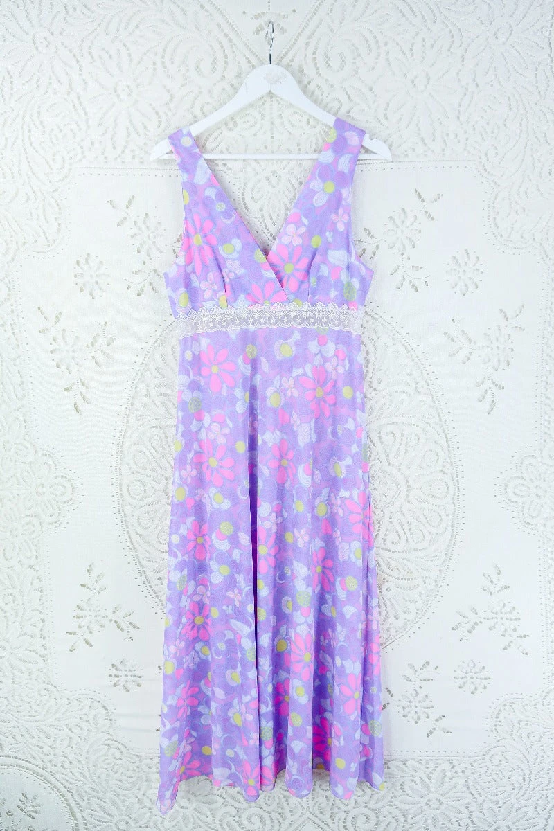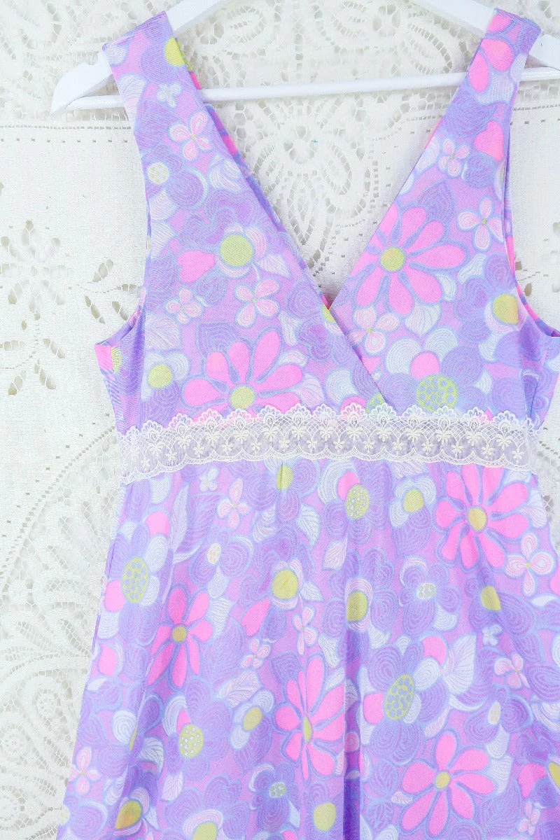 Such a fun and groovy maxi slip dress. Has the most amazing retro tonal pink/purple floral print and feminine lace detailing at the under-bust. The crossover bust and floaty skirt gives a flattering shape. Would make glamourous nightwear or a totally chic party dress!